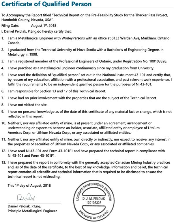 Certificate of Qualified Person To Accompany the Report titled “Technical Report on the Pre-Feasibility Study for the Thacker Pass Project, Humboldt County, Nevada, USA”. Filing Date: August 1st, 2018 I, Daniel Peldiak, P.Eng.do hereby certify that: 1. I am a Metallurgical Engineer with WorleyParsons with an office at 8133 Warden Ave, Markham, Ontario Canada. 2. I graduated from the Technical University of Nova Scotia with a Bachelor’s of Engineering Degree, in Metallurgy in 1998. 3. I am a registered member of the Professional Engineers of Ontario, under Registration No. 100103328. 4. I have practiced as a Metallurgical Engineer continuously since my graduation from University. 5. I have read the definition of “qualified person” set out in the National Instrument 43-101 and certify that, by reason of my education, affiliation with a professional association, and past relevant work experience, I fulfill the requirements to be an independent qualified person for the purposes of NI 43-101. 6. I am responsible for Section 13 and 17 of this Technical Report. 7. I have had no prior involvement with the properties that are the subject of the Technical Report. 8. I have not visited the site. 9. I have no personal knowledge as of the date of this certificate of any material fact or change, which is not reflected in this report. 10. Neither I, nor any affiliated entity of mine, is at present under an agreement, arrangement or understanding or expects to become an insider, associate, affiliated entity or employee of Lithium Americas Corp. or Lithium Nevada Corp., or any associated or affiliated entities. 11. Neither I, nor any affiliated entity of mine, own directly or indirectly, nor expect to receive, any interest in the properties or securities of Lithium Nevada Corp., or any associated or affiliated companies. 12. I have read NI 43-101 and Form 43-101F1 and have prepared the technical report in compliance with NI 43-101 and Form 43-101F1. 13. I have prepared the report in conformity with the generally accepted Canadian Mining Industry practices and, as of the date of the certificate, to the best of my knowledge, information and belief, the technical report contains all scientific and technical information that is required to be disclosed to ensure the technical report is not misleading. This 1st day of August, 2018 Daniel Peldiak, P.Eng. Principle Metallurgical Engineer