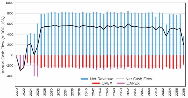A sensitivity analysis was performed against key variables in the economic model. The change in project NPV and IRR was calculated due to a 20% increase or decrease in any variable. The results of this sensitivity analysis are presented in Figure 22‑5 and Figure 22‑6.