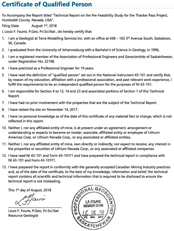 Certificate of Qualified Person To Accompany the Report titled “Technical Report on the Pre-Feasibility Study for the Thacker Pass Project, Humboldt County, Nevada, USA”. Filing Date: August 1st, 2018 I, Louis F. Fourie, P.Geo, Pri.Sci.Nat , do hereby certify that: 1. I am a Geologist at Terra Modelling Services Inc. with an office at 438 – 165 3rd Avenue South, Saskatoon, SK, Canada. 2. I graduated from the University of Johannesburg with a Bachelor’s of Science in Geology, in 1996, 3. I am a registered member of the Association of Professional Engineers and Geoscientists of Saskatchewan, under Registration No. 22198. 4. I have practiced as a Professional Engineer for 19 years. 5. I have read the definition of “qualified person” set out in the National Instrument 43-101 and certify that, by reason of my education, affiliation with a professional association, and past relevant work experience, I fulfill the requirements to be an independent qualified person for the purposes of NI 43-101. 6. I am responsible for Section 4 to 12, 14 and 23 and associated portions of Section 1 of this Technical Report. 7. I have had no prior involvement with the properties that are the subject of the Technical Report. 8. I have visited the site on November 14, 2017. 9. I have no personal knowledge as of the date of this certificate of any material fact or change, which is not reflected in this report. 10. Neither I, nor any affiliated entity of mine, is at present under an agreement, arrangement or understanding or expects to become an insider, associate, affiliated entity or employee of Lithium Americas Corp. or Lithium Nevada Corp., or any associated or affiliated entities. 11. Neither I, nor any affiliated entity of mine, own directly or indirectly, nor expect to receive, any interest in the properties or securities of Lithium Nevada Corp., or any associated or affiliated companies. 12. I have read NI 43-101 and Form 43-101F1 and have prepared the technical report in compliance with NI 43-101 and Form 43-101F1. 13. I have prepared the report in conformity with the generally accepted Canadian Mining Industry practices and, as of the date of the certificate, to the best of my knowledge, information and belief, the technical report contains all scientific and technical information that is required to be disclosed to ensure the technical report is not misleading. This 1st day of August, 2018 Louis F. Fourie, P.Geo, Pri.Sci.Nat Resource Geologist