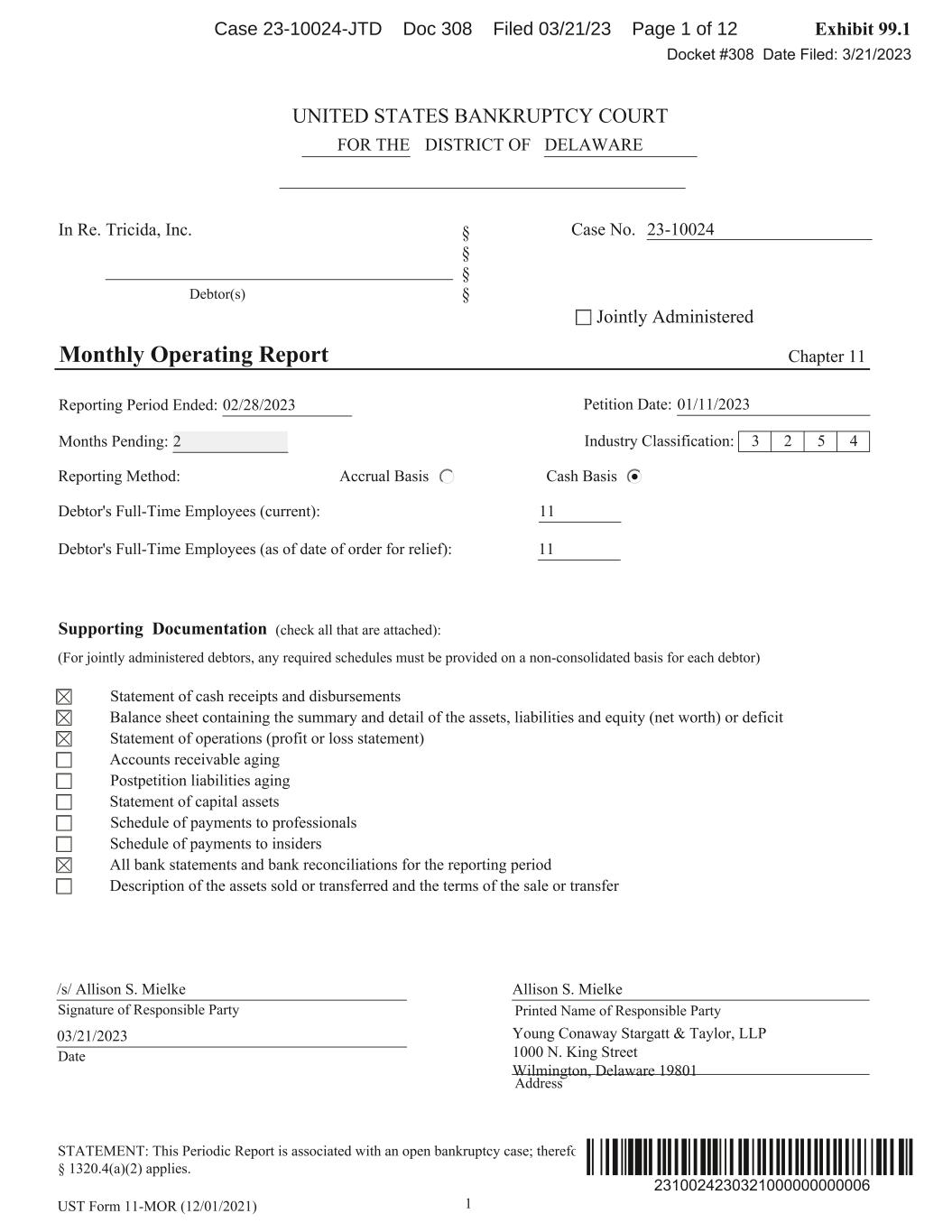 UST表格11-MOR(12/01/2021)1 UNITED STATES BANKRUPTCY COURT DISTRICT OFFOR THE DELAWARE In Re。tricida,Inc.债务人(s)§ § § § case No. 23-10024联合管理的月度经营报告第11章报告期截止日期:02/28/2023请愿日期:0 1/11/2023待决月份:2个行业分类:325 4报告方法:权责发生制现金制债务人的全职雇员(当前):11个债务人的全职雇员(截至救济命令发布之日):11个证明文件(检查所有随附的):(对于联合管理的债务人,必须在非合并基础上为每个债务人提供任何必要的附表)现金收支表资产负债表,其中包含资产的摘要和详细信息,负债和权益(净值)或赤字经营报表(损益表)应收账款账龄后负债账龄资本资产报表支付给专业人员的款项明细表支付给内部人的款项明细表报告期内所有银行对账单和银行对账单出售或转让的资产的描述和出售或转让的条件责任方的签名印刷责任方的姓名日期地址/s/Allison S. Mielke 03/21/2023 Allison S. Mielke Young Conaway Stargatt & Taylor,LLP 1000 N. King Street Wilmington,特拉华州19801声明:本定期报告与一个未决破产案有关;因此,适用文书减免法豁免5 C.F.R. § 1320.4(a)(2)。Case 23-10024-JTD Doc 308 Filed 03/21/23 Page 1 of 12 ¨ 2 ¤?87 # 5 & 0 « 2310024230321000000000006案卷# 308提交日期:3/21/2023 附件 99.1