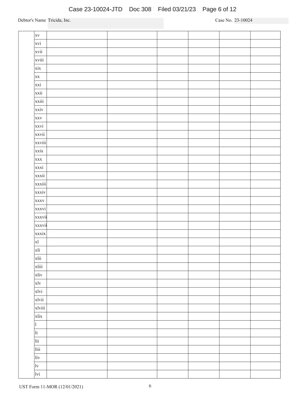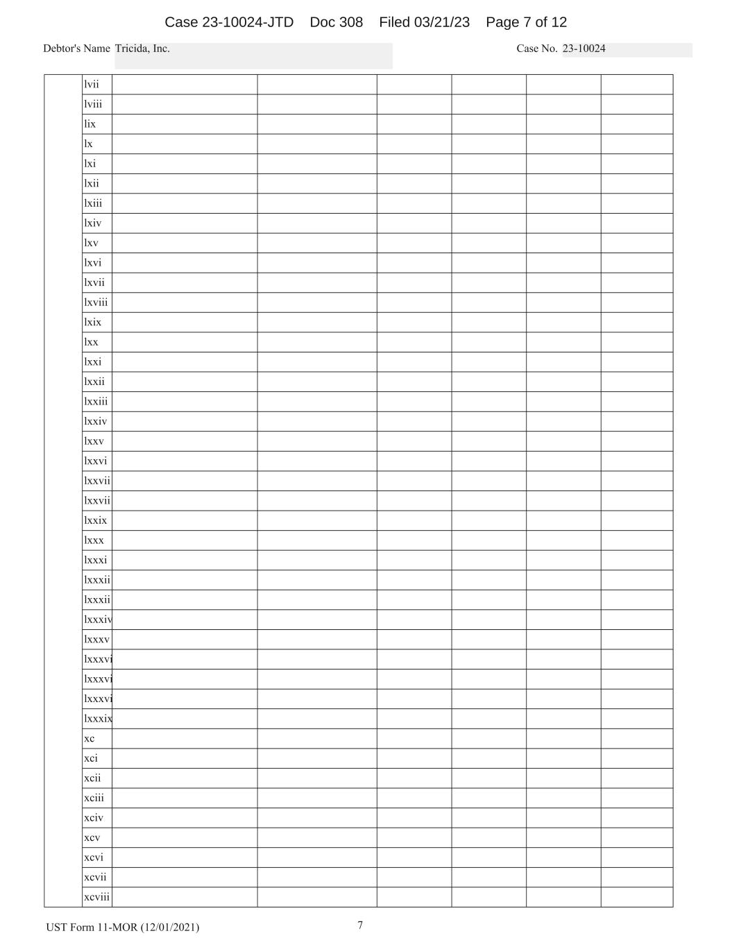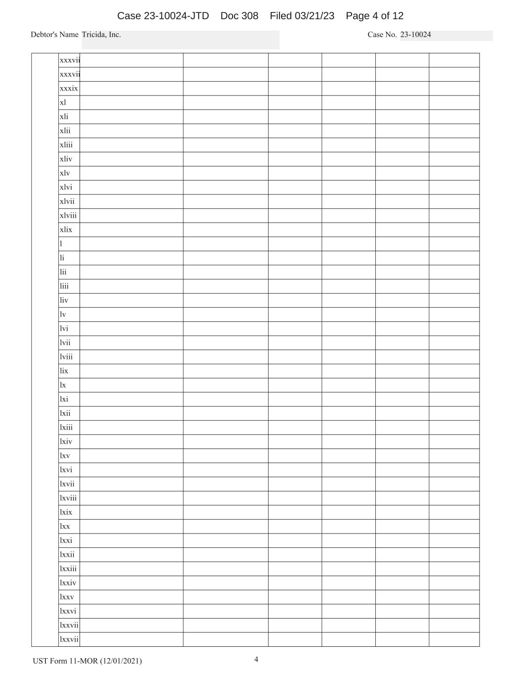 Ust format 11-mor(12/01/2021)4 debtor's name tricida,Inc. case No. 23-10024 xxxxvii xxxvii xxxxix XL xlii XLIII XLIV XLV XLVI XLVII XLVIII XLIX L Li lii liii Liv LV LVI lvii lvii Lix LX lxi lxii lxii lxii lxix lxx lxxi lxxii lxxxiv lxxv lxxvi lxxvi lxxvi lxxvii lxxvii case 23-10024-jtd doc 308 filed 03/21/23 page 4