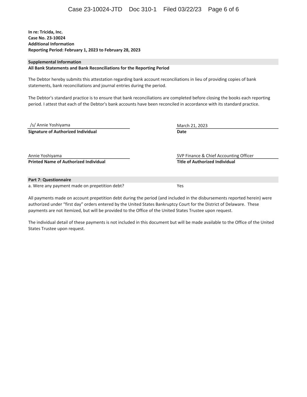 关于tricida,Inc.案例第23号10024补充信息报告期:2023年2月1日至2023年2月28日补充信息报告期内所有银行对账单和银行对账授权个人日期签署2023年3月21日Annie yoshiyama高级副总裁财务和首席会计官打印授权个人名称授权个人第7部分:调查表a.是否已就申请前债务支付任何款项?是债务人特此提交有关银行账户对账的证明,而不是在此期间提供银行对账单、银行对账和日记账分录的副本。债务人的标准做法是确保在每个报告期结账之前完成银行对账。我证明,债务人的每一个银行账户都是按照其标准做法对账的。在此期间,就申请前债务支付的所有款项(包括在本文报告的付款中)都是根据美国破产法院为特拉华州地区下达的“第一天”命令批准的。这些付款没有逐项列出,但将根据要求提供给美国受托人办公室。这些付款的具体细节未列入本文件,但应要求将提供给美国受托人办公室。判例23-10024-jtd doc 310-1提交案03/22/23第6页,共6页