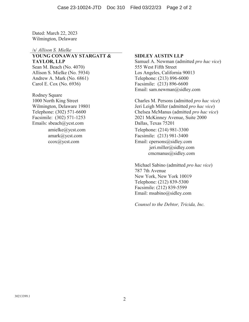 230213399.1日期:2023年3月22日Wilmington,Delaware/s/Allison S. Mielke YOUNG CONAWAY STARGATT & TAYLOR,LLP SIDLEY AUSTIN LLP Samuel A. Newman(pro hac vice录取)Sean M. Beach(No. 4070)Allison S. Mielke(No. 5934)Andrew A. Mark(No. 6861)Carol E. Cox(No. 6936)555 West Fifth Street Los Angeles,California 90013电话:(213)896-6000传真:(213)896-6600电子邮件:sam.newman@sidley.com Rodney Square 1000 North King Street Charles M. Persons(admitted pro hac vice)WilmingtonDelaware 19801 Jeri Leigh Miller(录取HAC副)电话:(302)571-6600 Chelsea McManus(录取HAC副)传真:(302)571-1253 2021 McKinney Avenue,Suite 2000电子邮件:sbeach@ycst.com Dallas,Texas 75201 amielke@ycst.com电话:(214)981-3300 amark@ycst.com传真:(213)981-3400 ccox@ycst.com电子邮件:cpersons@sidley.com jeri.miller@sidley.com cmcmanus@sidley.com Michael sabino(录取TERM0副)787 7th Avenue New York,New York 10019电话:(212)839-5300传真:(212)839-5599电子邮件:m