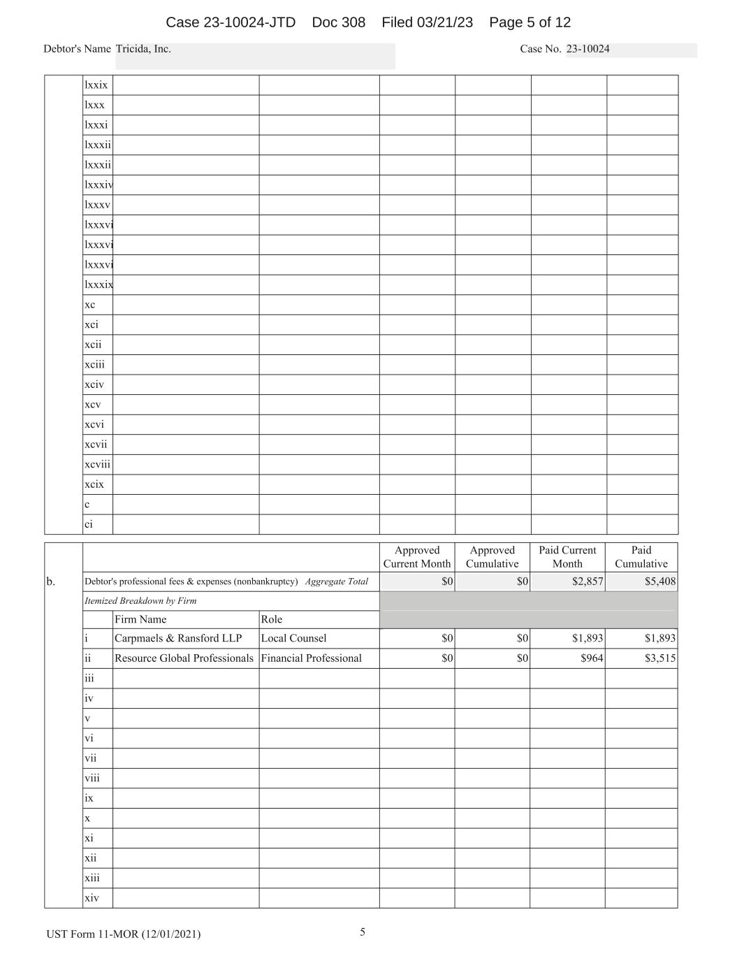 Ust format 11-mor(12/01/2021)5债务人名称tricida,Inc. case No. 23-10024 lxxix lxxx lxxx lxxi lxxxii lxxxii lxxxiv lxxxv lxxxvi lxxxvi lxxxvi lxxxxxix xc xci xcii xciii xciv xcv xcv xcvi xcvi xcvii xcvii xcix C CI approved current month approved cumulative paid current month paid cumulative B.债务人的专业费用和开支(非破产)总计$ 0 $ 2,857 $ 5,408 itemized detailed by firm name role I carpmaels & Ransford LLP