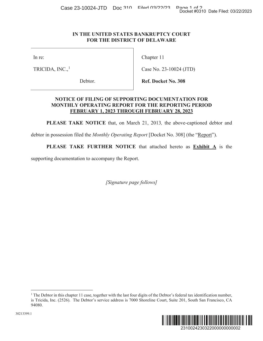30213399.1 IN THE UNITED STATES BANKRUPTCY COURT FOR THE DISTRICT OF DELAWARE In re:TRICIDA,INC.,1 Debtor。第11章案件编号:23-10024(JTD)Ref。备案单第308号:提交报告期月度经营报告的支持性文件的通知2023年2月1日至2023年2月28日请注意,2013年3月21日,上述债务人和持有资产的债务人提交了《月度经营报告》[备案单第308号](简称“报告”)。请进一步注意,本报告所附附件 A为证明文件。[签名页如下] 1在第11章的情况下,债务人连同债务人联邦税务识别号码的最后四位数字是tricida,Inc.(2526)。债务人的服务地址是7000 Shoreline Court,Suite 201,South San Francisco,加利福尼亚州 94080。Case 23-10024-jtd doc 310 filed 03/22/23 page 1 of 2 ¨ 2 ¤?87 # 6 " g « 231002423032200000000000002案卷# 0310提交日期:03/22/2023