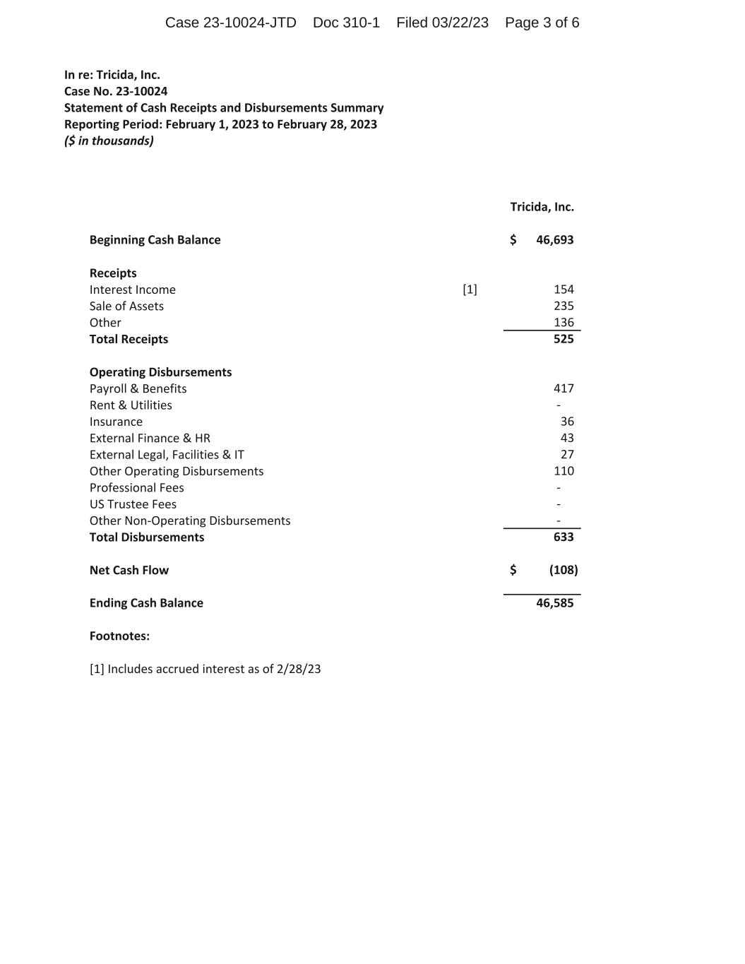 关于:Tricida, Inc.案例第23号10024现金收支报表摘要报告期:2023年2月1日至2023年2月28日(单位:千美元)Tricida, Inc.期初现金余额46,693美元收入利息收入[ 1 ] 154出售资产235其他136总收入525经营支出工资和福利417租金和公用事业保险36外部财务和人力资源43外部法律,Facilities & it 27 Other Operating Dispayments 110 Professional Fees US Trustee Fees Other Non-Operating Dispayments Total Dispayments 633 Net Cash Flow(108)$期末现金余额46,585脚注:[ 1 ] includes accrued interest as of 2/28/23 case 23-10024-jtd doc 310-1 filed 03/22/23 page 3 of 6