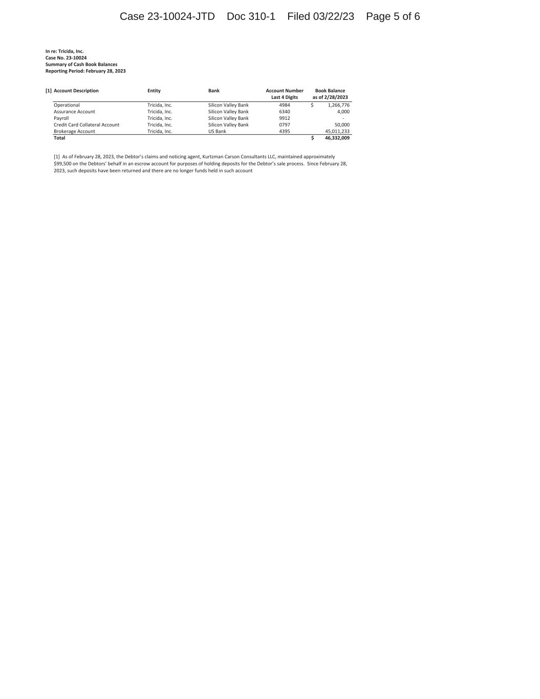 In re:tricida,Inc. case No. 23 10024现金账簿余额汇总表报告期:February 28,2023 [ 1 ] account description实体银行帐号帐簿余额后4位数截至2/28/2023 operating tricida,Inc. Silicon Valley Bank 49841,266,776 $ assurance account tricida,Inc. Silicon Valley Bank 63404,000 payroll tricida,Inc. Silicon Valley Bank 9912 credit card collateral account tricida,Inc. Silicon Valley Bank 079750,000 brokerage account tricida,Inc. US bank 439545,011,233 total 46,332,009 $ [在代管账户中代表债务人保留了大约99500美元,用于为债务人的出售过程保留存款。自2023年2月28日起,此种存款已被退回,而此种账户案件中不再有资金23-10024-jtd doc 310-1提交03/22/23第5页,共6页