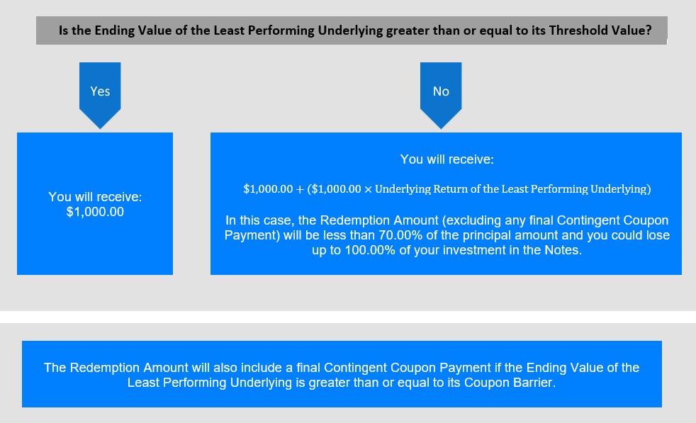 •假设票据未在到期前被赎回,如果任何标的较其起始价值下跌超过30%,在到期时,您的投资将面临表现最差的标的价值下跌的1:1下行风险,最多100%的本金面临风险;否则,在到期时,您将收到本金金额。到期时,如果每个标的在最终观察日的收盘水平大于或等于其起始值的70.00%,您还将收到一笔最终的或有息票支付。