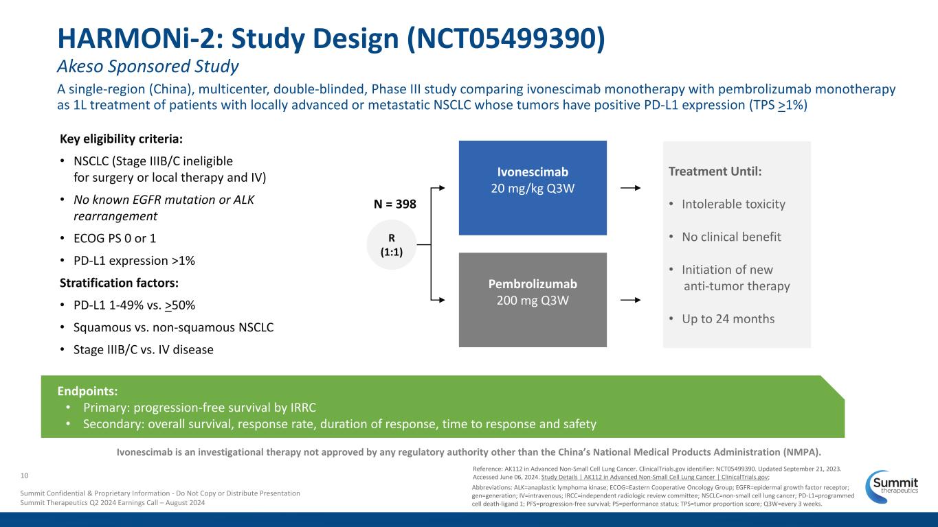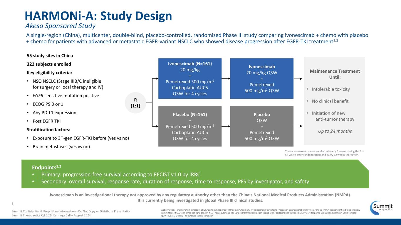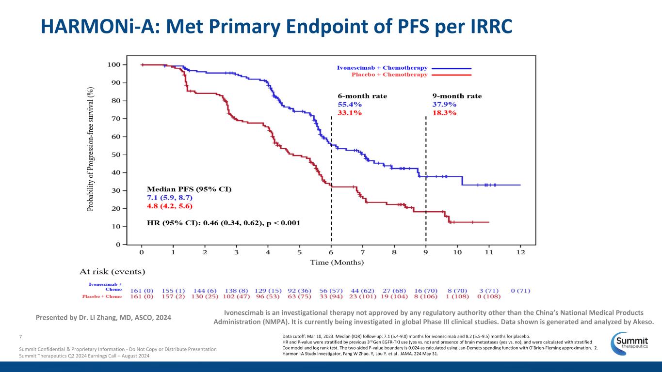 Harmoni-A:研究设计单一区域(中国)、多中心、双盲、安慰剂对照、ivonescimab + chemo与安慰剂+ chemo在EGFR-TKI治疗后显示疾病进展的晚期或转移性EGFR变异NSCLC患者中的随机III期研究1、中国55个研究地点322名受试者入组关键合格标准:• NSQ NSCLC(IIIB/C期不符合手术或局部治疗条件和IV)• EGFR敏感突变阳性• ECOG PS 0或1 •任何PD-L1表达• EGFR后TKI分层因素:•之前暴露于第三代EGFR-TKI(是vs否)•脑转移(是vs否)终点1,2 •首要:IRRC根据RECIST v1.0的无进展生存期•次要:总生存期、应答率、应答持续时间、应答时间、研究者的PFS,和安全性伊沃奈斯单抗(N = 161)20mg/kg +培美曲塞500mg/m2卡铂AUC5 Q3W 4个周期伊沃奈斯单抗20mg/kg Q3W +培美曲塞500mg/m2 Q3W安慰剂(N = 161)+培美曲塞500mg/m2卡铂AUC5 Q3W安慰剂Q3W +培美曲塞500mg/m2 Q3W维持治疗4个周期,直到:•不可耐受的毒性•无临床获益•开始新的抗肿瘤疗法长达24个月R(1:1)简称:chemo =化疗;ECOG =东部肿瘤协作组;EGFR =表皮生长因子受体;gen =生成;IV =静脉注射;IRRC =独立放射审评委员会;NSCLC =非小细胞肺癌;NSQ =非鳞状;PD-L1 =程序性细胞死亡-配体1;PS =性能状态;RECIST v1.1 =实体瘤中的反应评估标准;Q3W =每3周;TKI =酪氨酸激酶抑制剂。在随机分组后的前54周内,每6周进行6次Akeso赞助研究肿瘤评估,此后每12周进行一次。Summit机密&专有信息-不复制或分发演示文稿Summit Therapeutics 2024年第二季度财报电话会议– 2024年8月Ivonescimab是一种研究性疗法,未经中国国家药品监督管理局(NMPA)以外的任何监管机构批准。目前正在全球III期临床研究中进行研究。