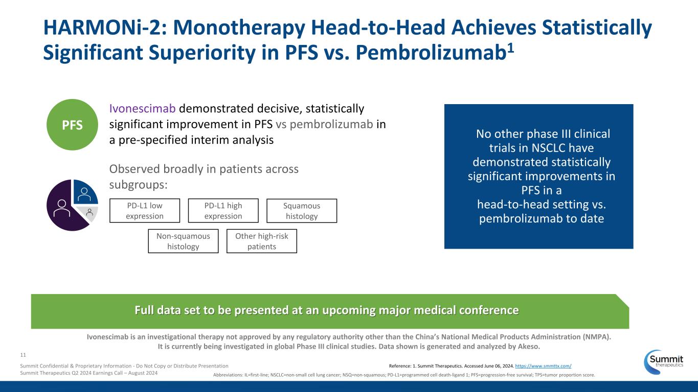 Harmoni-2:单药疗法头对头在PFS vs. pembrolizumab1方面实现具有统计学意义的优势将在即将举行的重大医学会议上展示的完整数据集简称:IL =一线;NSCLC =非小细胞肺癌;NSQ =非鳞状;PD-L1 =程序性细胞死亡-配体1;PFS =无进展生存期;TPS =肿瘤比例评分。NSCLC中没有其他III期临床试验证明与帕博利珠单抗相比,在头对头环境中的PFS有统计学意义的改善。迄今为止,伊沃奈西单抗在一项预先指定的中期分析中与帕博利珠单抗相比,在跨亚组患者中广泛观察到的PFS有决定性的、统计学意义的改善:PD-L1低表达PD-L1高表达鳞状组织学非鳞状组织学其他高风险患者11参考:1。Summit Therapeutics。访问日期:2024年6月6日。https://www.smmttx.com/Summit Confidential & Proprietary Information-Do not copy or distribute presentation Summit Therapeutics 2024年第二季度财报电话会议– August 2024 ivonescimab是一种未获中国国家药品监督管理局(NMPA)以外的任何监管机构批准的研究性疗法。目前正在全球III期临床研究中进行研究。显示的数据由Akeso生成和分析。