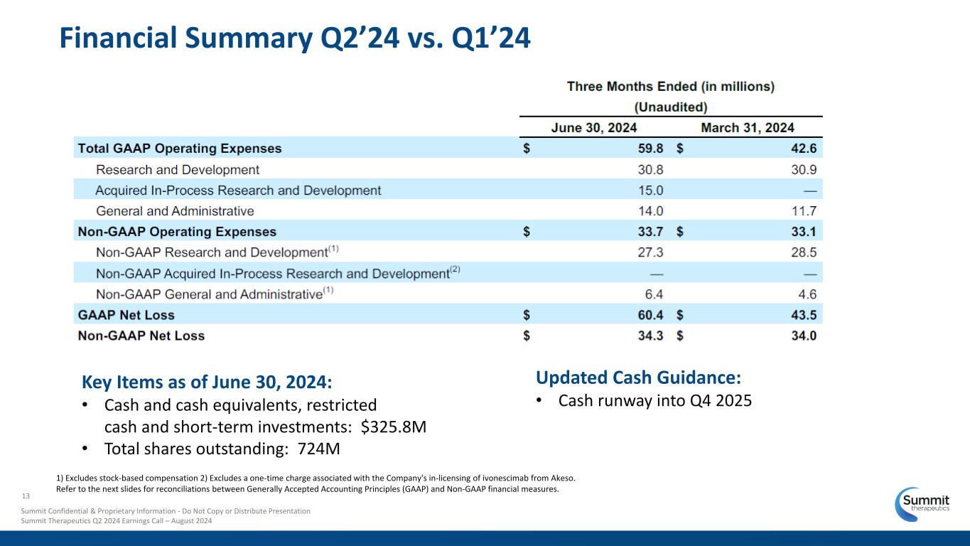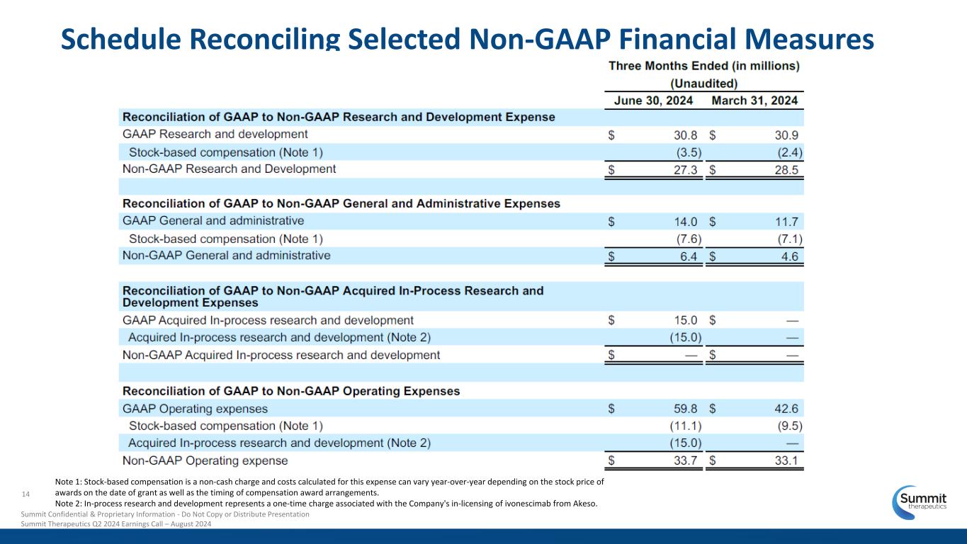 财务摘要Q2’24与Q1’24截至2024年6月30日的关键项目:•现金和现金等价物、限制性现金和短期投资:3.258亿美元•已发行股票总数:7.24亿股更新后的现金指引:•到2025年第四季度的现金流1)不包括基于股票的薪酬2)不包括与公司从Akeso获得ivonescimab许可相关的一次性费用。有关公认会计原则(GAAP)和非GAAP财务指标之间的调节,请参阅下一张幻灯片。13 Summit机密和专有信息-不复制或分发演示文稿Summit Therapeutics 2024年第二季度财报电话会议– 2024年8月