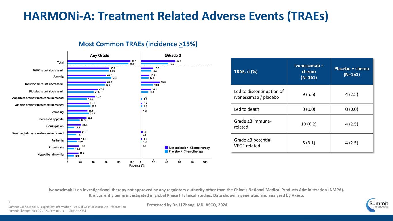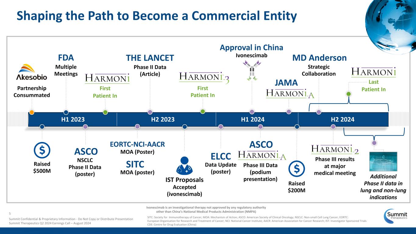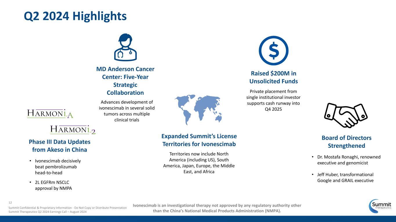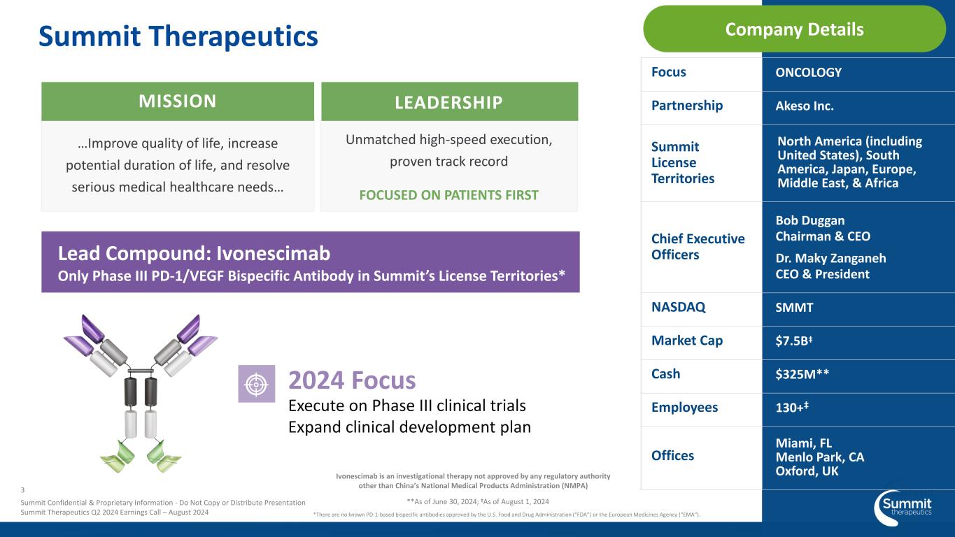 前瞻性陈述2本演示文稿中有关公司未来预期、计划和前景的任何陈述,包括但不限于关于公司候选产品的临床和临床前开发、与公司与Akeso Inc.的合作关系相关的进入和行动的陈述、公司的预期支出和现金跑道、公司候选产品的治疗潜力、公司候选产品的潜在商业化、临床试验数据的启动、完成和可用性的时间、上市批准申请的潜在提交、潜在收购,关于先前披露的市场股票发行计划(“ATM计划”)、预期收益及其用途的陈述,以及包含“预期”、“相信”、“继续”、“可能”、“估计”、“预期”、“打算”、“可能”、“计划”、“潜力”、“预测”、“项目”、“应该”、“目标”、“将”等词语的其他陈述,以及类似的表述,构成1995年《私人证券诉讼改革法案》含义内的前瞻性陈述。由于各种重要因素,实际结果可能与此类前瞻性陈述所表明的结果存在重大差异,包括我们对与ivonescimab的开发和商业化活动相关的基础数据的评估结果、与包括食品和药物管理局在内的监管机构讨论的结果、未来临床试验启动所固有的不确定性、正在进行和未来临床试验数据的可用性和时间、此类试验的结果及其成功,以及可能影响我们临床试验和运营的时间和状态的全球公共卫生危机,临床试验的初步结果是否会预测该试验的最终结果,或者早期临床试验或临床前研究的结果是否会指示后期临床试验的结果,是否会出现扩大公司候选药物管道的业务发展机会,包括但不限于通过潜在收购和/或与其他实体合作,是否会出现对监管批准的预期,影响政府合同和资金奖励的法律法规,资金的可用性足以满足公司向美国证券交易委员会提交的文件的“风险因素”部分中讨论的公司可预见和不可预见的运营费用和资本支出要求以及其他因素。我们正在进行的试验的任何改变都可能导致延误,影响我们未来的开支,并为我们的商业化努力增加不确定性,以及影响成功完成ivonescimab临床开发的可能性。因此,受众不应过分依赖前瞻性陈述或信息。此外,本演示文稿中包含的任何前瞻性陈述仅代表公司截至本演示文稿发布之日的观点,不应被视为代表公司截至任何后续日期的观点。公司明确表示不承担更新本演示文稿中包含的任何前瞻性陈述的任何义务。ivonescimab是一种未获中国国家药品监督管理局(NMPA)以外的任何监管机构批准的研究性疗法Summit机密和专有信息-不复制或分发演示文稿Summit Therapeutics 2024年第二季度财报电话会议– 2024年8月