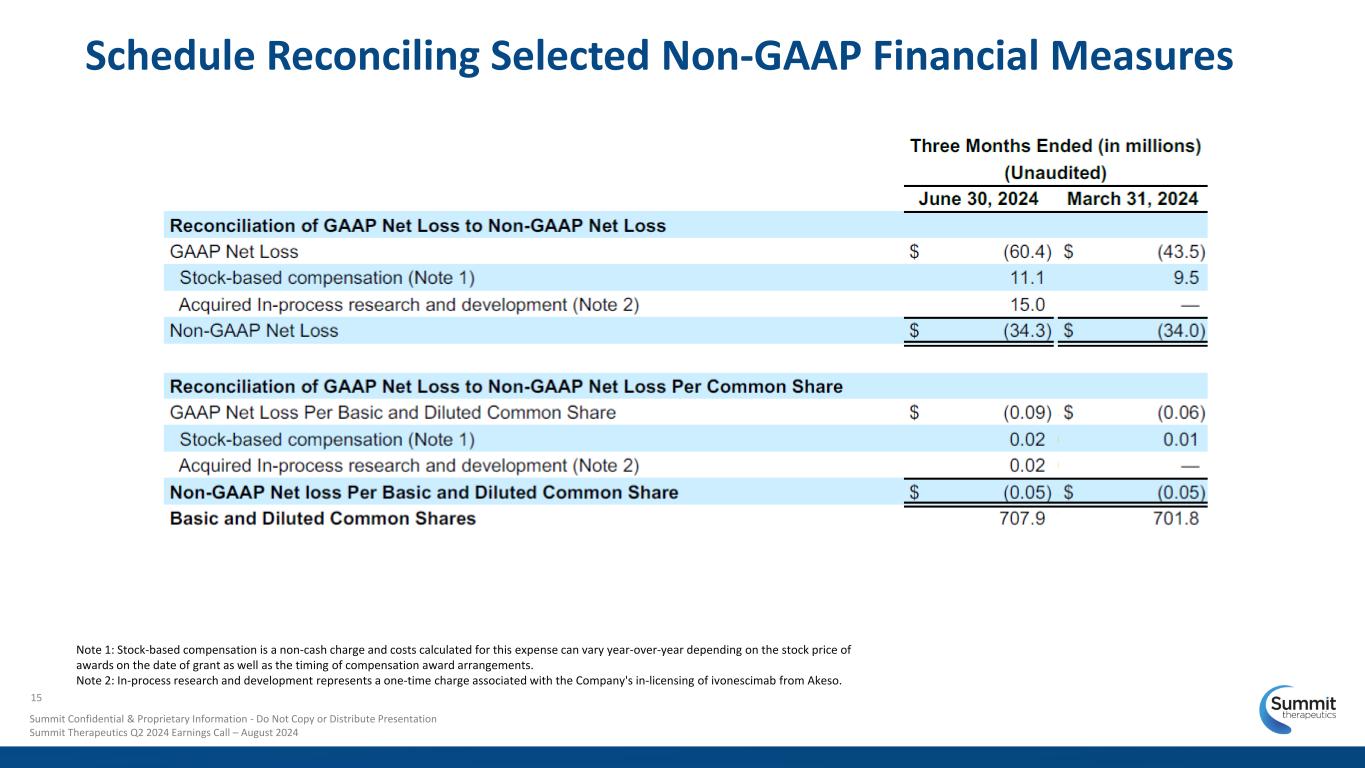 附表调节选定的非公认会计原则财务措施注1:基于股票的薪酬是一项非现金费用,根据授予日奖励的股票价格以及补偿奖励安排的时间安排,为这笔费用计算的成本可能会逐年变化。注2:进行中的研发是与公司从Akeso获得ivonescimab的许可相关的一次性费用。14 Summit机密和专有信息-不复制或分发演示文稿Summit Therapeutics 2024年第二季度财报电话会议– 2024年8月