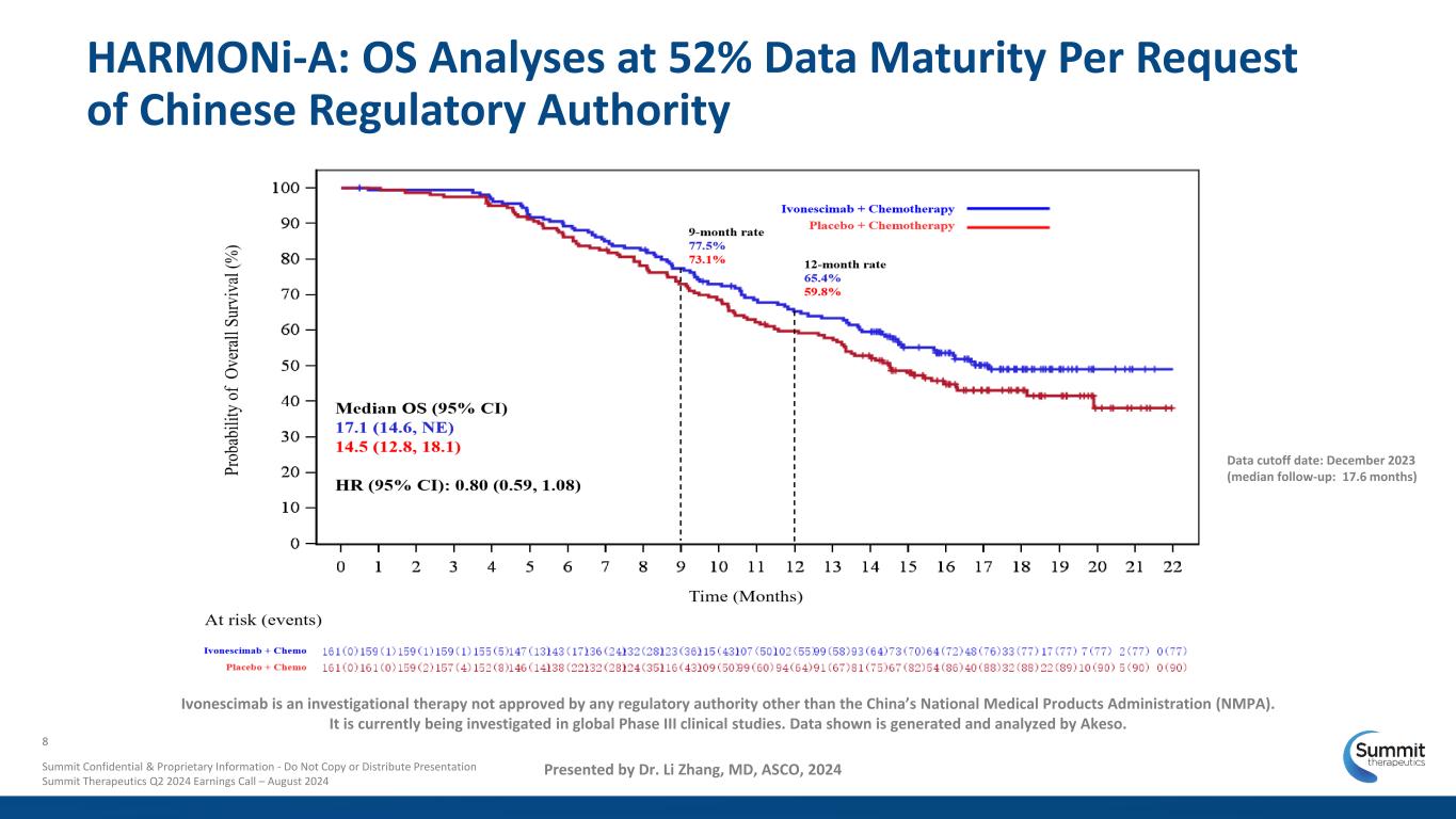 7数据截止日期:2023年3月10日。中位(IQR)随访:ivonescimab为7.1(5.4-9.0)个月,安慰剂为8.2(5.5-9.5)个月。HR和P值通过先前第3代EGFR-TKI使用(是vs.否)和存在脑转移(是vs.否)进行分层,并通过分层Cox模型和对数秩检验进行计算。使用具有O’brien-Fleming近似的LAN-Demets支出函数计算得到的双边P值边界为0.024。2.Harmoni ——学习研究者,Fang W Zhao。Y,Lou Y.等JAMA。224日5月31日。7 Harmoni-A:根据IRRC Summit满足PFS的主要终点机密和专有信息-不复制或分发演示文稿Summit Therapeutics 2024年第二季度财报电话会议– 2024年8月由ASCO医学博士Li Zhang介绍,2024年ivonescimab是一种未经中国国家药品监督管理局(NMPA)以外的任何监管机构批准的研究性疗法。目前正在全球III期临床研究中进行研究。显示的数据由Akeso生成和分析。