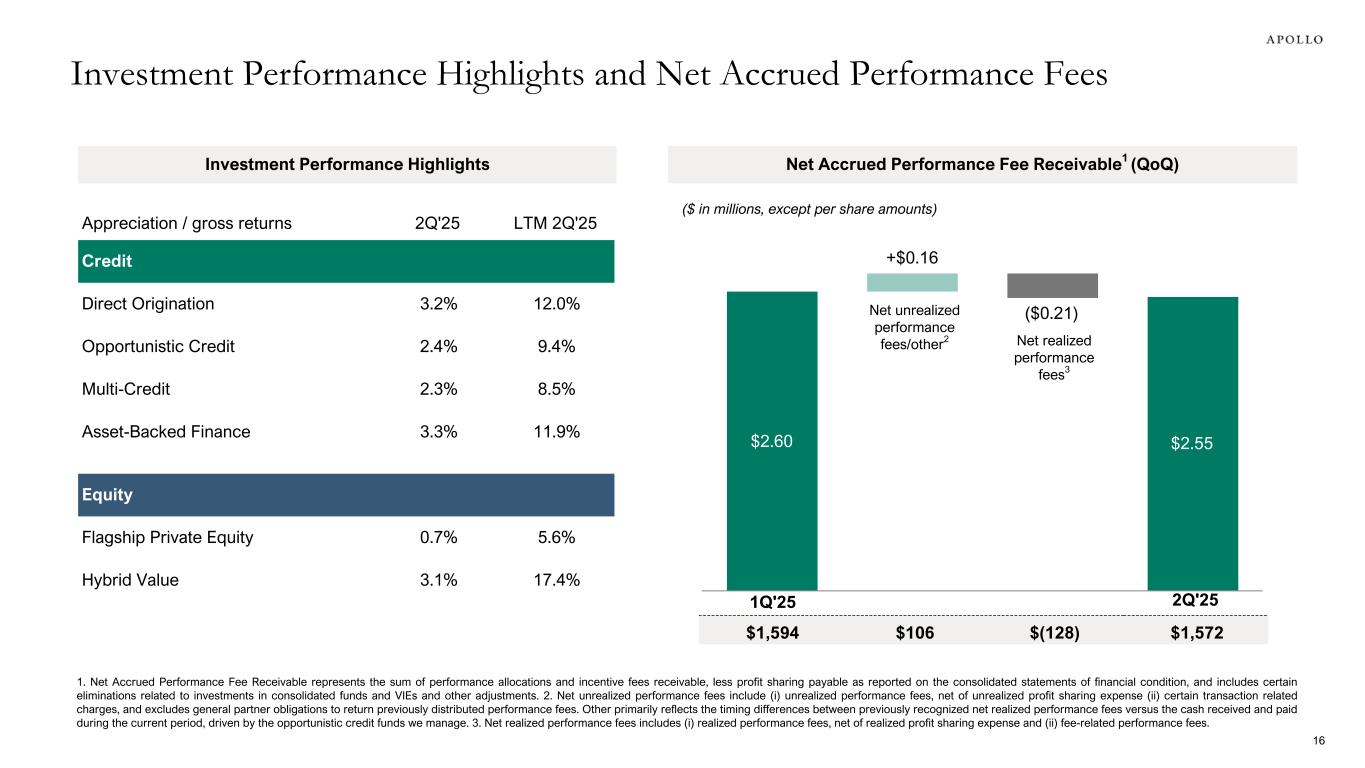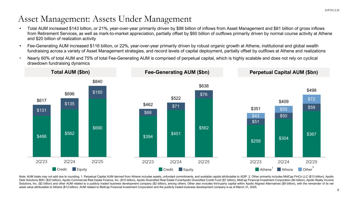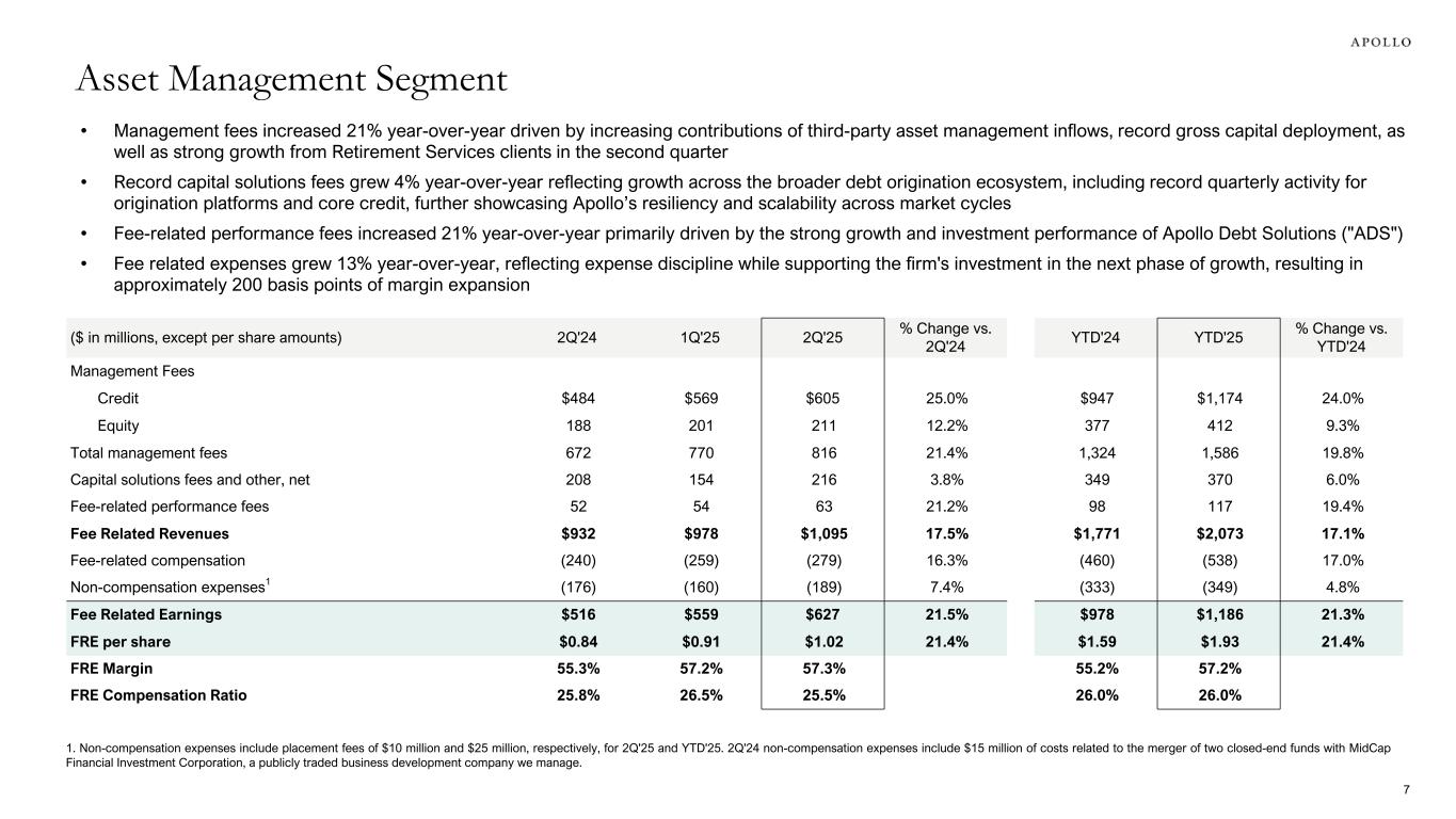 •管理费同比增长21%,这得益于第三方资产管理流入的贡献增加、创纪录的资本部署总额,以及第二季度退休服务客户的强劲增长•创纪录的资本解决方案费用同比增长4%,反映出整个更广泛的债务发起生态系统的增长,包括发起平台和核心信贷的创纪录季度活动,进一步显示了Apollo在整个市场周期中的弹性和可扩展性•与费用相关的业绩费用同比增长21%,这主要是受Apollo Debt Solutions(“ADS”)强劲增长和投资业绩的推动•与费用相关的费用同比增长13%,反映费用纪律,同时支持公司对下一阶段增长的投资,导致利润率扩张约200个基点(以百万美元计,每股金额除外)2Q‘24 1Q’25 2Q‘25 %变化与2Q’24 YTD‘24 YTD’25 %变化与YTD'24管理费信用$ 484 $ 569 $ 60525.0% $ 947 $ 1,17424.0%股权18820121112.2% 3774129.3%总管理费67277081621.4% 1,3241,58619.8%资本解决方案费用和其他,净额2081542163.8% 3493706.0%与费用相关的履约费用52546321.2% 9811719.4%与费用相关的收入$ 932 $ 978 $ 1,09517.5% $ 1,771 $ 2,07317.1%与费用相关的补偿(240)(259)(279)16.3%(460)(538)17.0%非补偿费用1(176)(160)(189)7.4%(333)(349)4.8%与费用相关的收益$ 516 $ 559 $ 62721.5% $ 978 $ 1,18621.3% FRE per share $ 0.84 $ 0.91 $ 1.02 21.4% $ 1.59 $ 1.93 21.4% FRE margin 55.3% 57.2% 57.3% 55.2% 57.2% FRE补偿比率25.8% 26.5% 25.5% 26.0%资产非补偿费用包括2Q‘25和YTD’25分别为1000万美元和2500万美元的安置费。2Q'24非补偿费用包括与两只封闭式基金与我们管理的上市业务发展公司Midcap Financial Investment Corporation合并相关的1500万美元费用。7