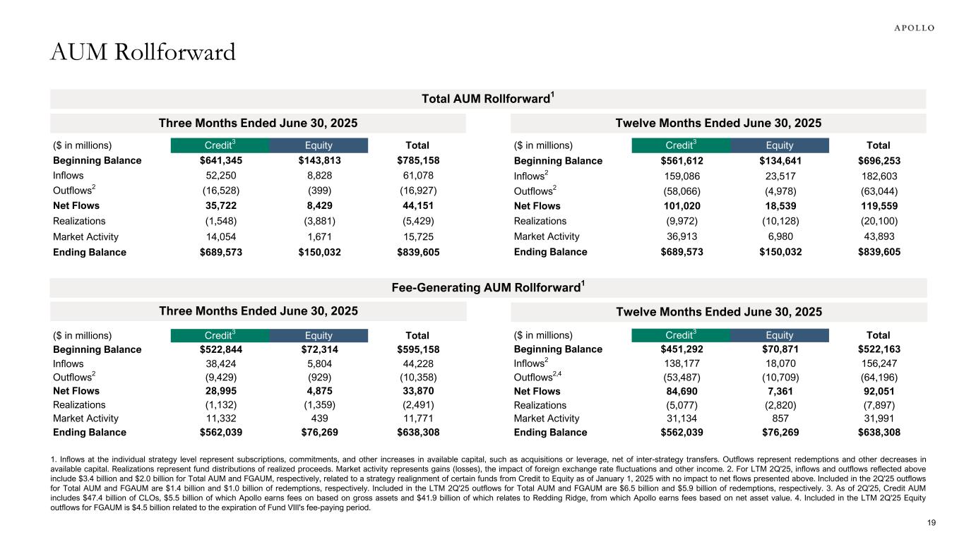 (百万美元)Credit3 Equity总期初余额$ 641,345 $ 143,813 $ 785,158流入52,2508,82861,078流出2(16,528)(399)(16,927)净流量35,7228,42944,151变现(1,548)(3,881)(5,429)市场活动14,0541,67115,725期末余额$ 689,573 $ 150,032 $ 839,605截至2025年6月30日的三个月(百万美元)Credit3 Equity总期初余额$ 561,612 $ 134,641 $ 696,253流入2159,08623,517182,603流出2(58,066)(4,978)(63,044)净流量101,0 2018,2025年(百万美元)Credit3 Equity总期初余额$ 522,844 $ 72,314 $ 595,158流入38,4245,80444,228流出2(9,429)(929)(10,358)净流量28,9954,87533,870变现(1,132)(1,359)(2,491)市场活动11,33243911,771期末余额$ 562,039 $ 76,269 $ 638,308截至2025年6月30日的三个月(百万美元)Credit3 Equity总期初余额$ 451,292 $ 70,871 $ 522,163流入2138,17718,070156,247流出2,4(53,487)(10,709)(64,196)净流量84,6907,36单个策略层面的流入代表认购、承诺和可用资本的其他增加,例如收购或杠杆,扣除策略间转移。流出代表赎回和可用资本的其他减少。变现代表已变现收益的资金分配。市场活动代表收益(损失)、外汇汇率波动的影响和其他收益。2.就LTM 2Q'25而言,上述流入和流出包括总AUM和FGAUM分别为34亿美元和20亿美元,这与截至2025年1月1日将某些资金从信贷调整为股权的战略调整有关,对上述净流动没有影响。2Q'25流出的总AUM和FGAUM中分别包括14亿美元和10亿美元的赎回。LTM 2Q'25流出的总AUM和FGAUM中分别包括65亿美元和59亿美元的赎回。3.截至2Q'25,Credit AUM包括474亿美元的CLO,其中55亿美元由Apollo根据总资产赚取费用,其中419亿美元与Redding Ridge相关,Apollo根据资产净值从中赚取费用。4.LTM 2Q'25 FGAUM的股权流出中包括与基金VIII的费用支付期到期相关的45亿美元。AUM前滚19