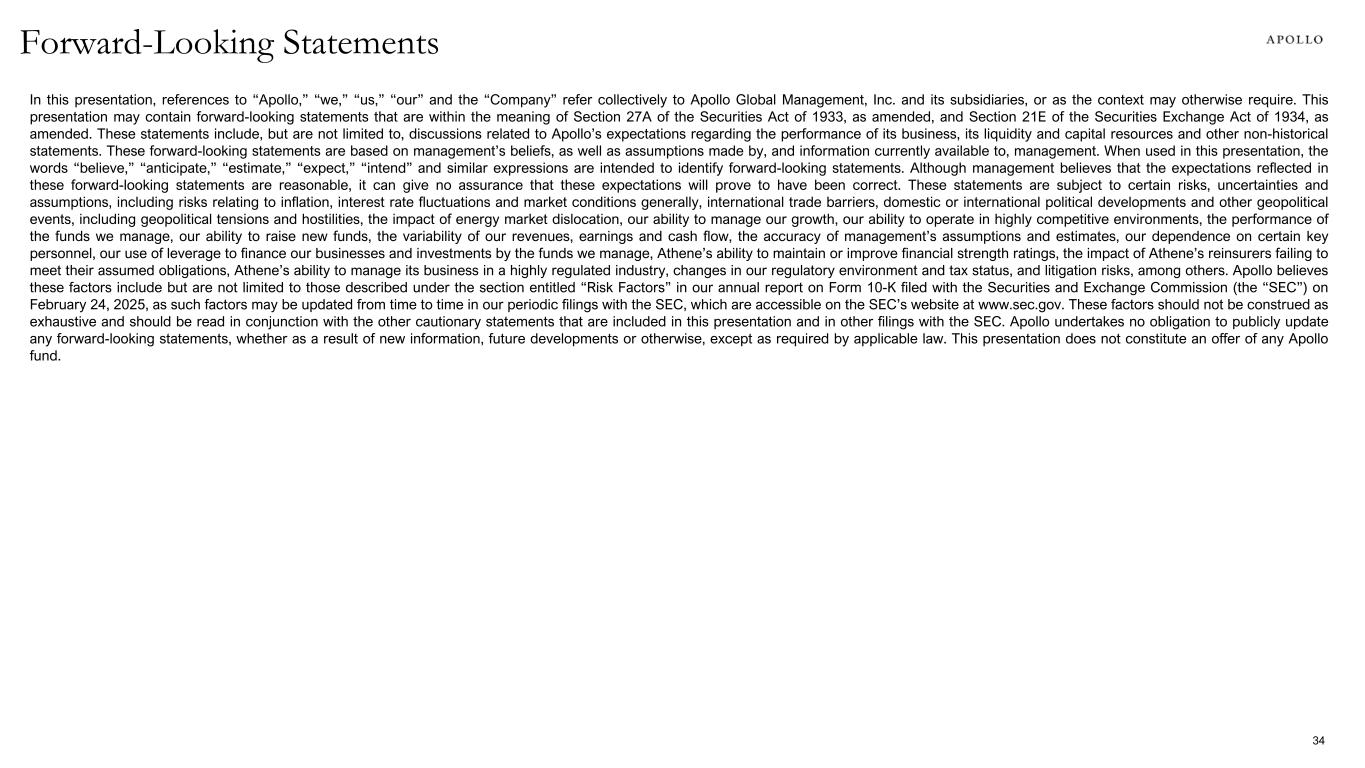 本演示文稿中的前瞻性陈述中,对“Apollo”、“我们”、“我们”、“我们的”和“公司”的提及是指Apollo Global Management,Inc.及其子公司,或视上下文可能另有要求。本演示文稿可能包含符合经修订的《1933年证券法第27A条》和经修订的《1934年证券交易法》第21E条含义的前瞻性陈述。这些声明包括但不限于与Apollo对其业务表现、流动性和资本资源的预期以及其他非历史性声明相关的讨论。这些前瞻性陈述基于管理层的信念,以及管理层做出的假设和目前可获得的信息。当在本演示文稿中使用时,“相信”、“预期”、“估计”、“预期”、“打算”和类似表达旨在识别前瞻性陈述。尽管管理层认为这些前瞻性陈述中反映的预期是合理的,但无法保证这些预期将被证明是正确的。这些报表受到某些风险、不确定性和假设的影响,包括与通货膨胀、利率波动和一般市场状况、国际贸易壁垒、国内或国际政治发展和其他地缘政治事件有关的风险,包括地缘政治紧张局势和敌对行动、能源市场错位的影响、我们管理增长的能力、我们在竞争激烈的环境中运营的能力、我们管理的基金的表现、我们筹集新资金的能力、我们的收入、收益和现金流的可变性、管理层的假设和估计的准确性、我们对某些关键人员的依赖,我们使用杠杆通过我们管理的基金为我们的业务和投资提供资金,Athene维持或提高财务实力评级的能力,Athene的再保险公司未能履行其承担的义务的影响,Athene在高度监管的行业中管理其业务的能力,我们的监管环境和税务状况的变化,以及诉讼风险等。Apollo认为,这些因素包括但不限于我们于2025年2月24日向美国证券交易委员会(“SEC”)提交的10-K表格年度报告中题为“风险因素”一节中描述的因素,因为这些因素可能会在我们向SEC提交的定期文件中不时更新,这些文件可在SEC网站www.sec.gov上查阅。这些因素不应被解释为详尽无遗,应与本演示文稿和提交给SEC的其他文件中包含的其他警示性声明一起阅读。Apollo不承担公开更新任何前瞻性声明的义务,无论是由于新信息、未来发展或其他原因,除非适用法律要求。本演示文稿不构成任何Apollo基金的要约。34