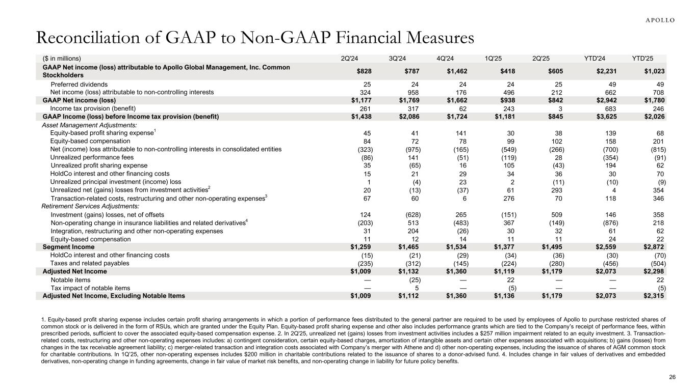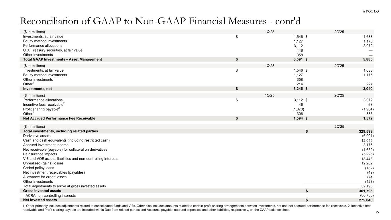 (百万美元)2Q‘24 3Q’24 3Q‘24 1Q’25 2Q‘25 YTD’24 YTD'25 GAAP归属于Apollo Global管理的净利润(亏损),Inc.普通股股东$ 828 $ 787 $ 1,462 $ 418 $ 605 $ 2,231 $ 1,023优先股息25242424254949归属于非控股权益的净收入(亏损)324958176496212662708 GAAP净收入(亏损)$ 1,177 $ 1,769 $ 1,662 $ 938 $ 842 $ 2,942 $ 1,780所得税准备金(收益)261317622433683246 GAAP收入(亏损)所得税前拨备(收益)$ 1,438 $ 2,086 $ 1,724 $ 1,181 $ 845 $ 3,625 $ 2,026资产管理调整:基于股权的利润分享费用1 4541141303813968基于股权的薪酬84727899102158201归属于合并实体非控制性权益的净(收益)亏损(323)(975)(165)(549)(266)(700)(815)未实现业绩费用(86)141(51)(119)28(354)(91)未实现利润分享费用35(65)16105(43)19462 HoldCo利息及其他融资成本15212934363070未实现本金投资(收益)损失1(4)232(11)(10)(9)投资活动未实现净(收益)损失220(13)(37)612934354与交易相关的成本、重组和其他营业外支出36760627670118346退休服务调整:投资(收益)损失,扣除抵消后124(628)265(151)509146358保险负债及相关衍生工具的非经营性变动4(203)513(483)367(149)(876)218整合,重组和其他非经营费用31204(26)30326162股权报酬11121411112422分部收入$ 1,259 $ 1,465 $ 1,534 $ 1,377 $ 1,495 $ 2,559 $ 2,872控股公司利息和其他融资成本(15)(21)(29)(34)(36)(30)(70)税收和相关应付款项(235)(312)(145)(224)(280)(456)(504)调整后净收入$ 1,009 $ 1,132 $ 1,360 $ 1,119 $ 1,179 $ 2,073 $ 2,298显着项目——(25)— 22 —— 22显着项目的税收影响—— 5 ——(5)调整后的净收入,不包括显着项目$ 1,009 $ 1,112 $ 1,360以股权为基础的利润分享费用包括某些利润分享安排,其中分配给普通合伙人的业绩费用的一部分要求被Apollo的员工用于购买普通股的限制性股票或以RSU的形式交付,这些是根据股权计划授予的。权益型利润分成费用等还包括与公司收到绩效费挂钩的绩效授予,在规定期限内,足以支付相关的权益型补偿费用。2.2Q'25,投资活动产生的未实现净(收益)损失包括与一项股权投资相关的2.57亿美元减值。3.与交易相关的成本、重组和其他营业外支出包括:a)或有对价、某些基于股权的费用、无形资产摊销和与收购相关的某些其他费用;b)应收税款协议负债变化的收益(损失);c)与公司与Athene合并相关的与合并相关的交易和整合成本以及d)其他营业外支出,包括为慈善捐款发行AGM普通股股票。25年第一季度的其他非经营费用包括与向捐助者建议的基金发行股票相关的2亿美元慈善捐款。4.包括衍生工具和嵌入式衍生工具公允价值变动、融资协议非经营性变动、市场风险收益公允价值变动、未来保单收益负债非经营性变动。GAAP与非GAAP财务指标的调节26