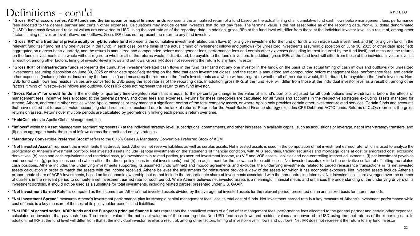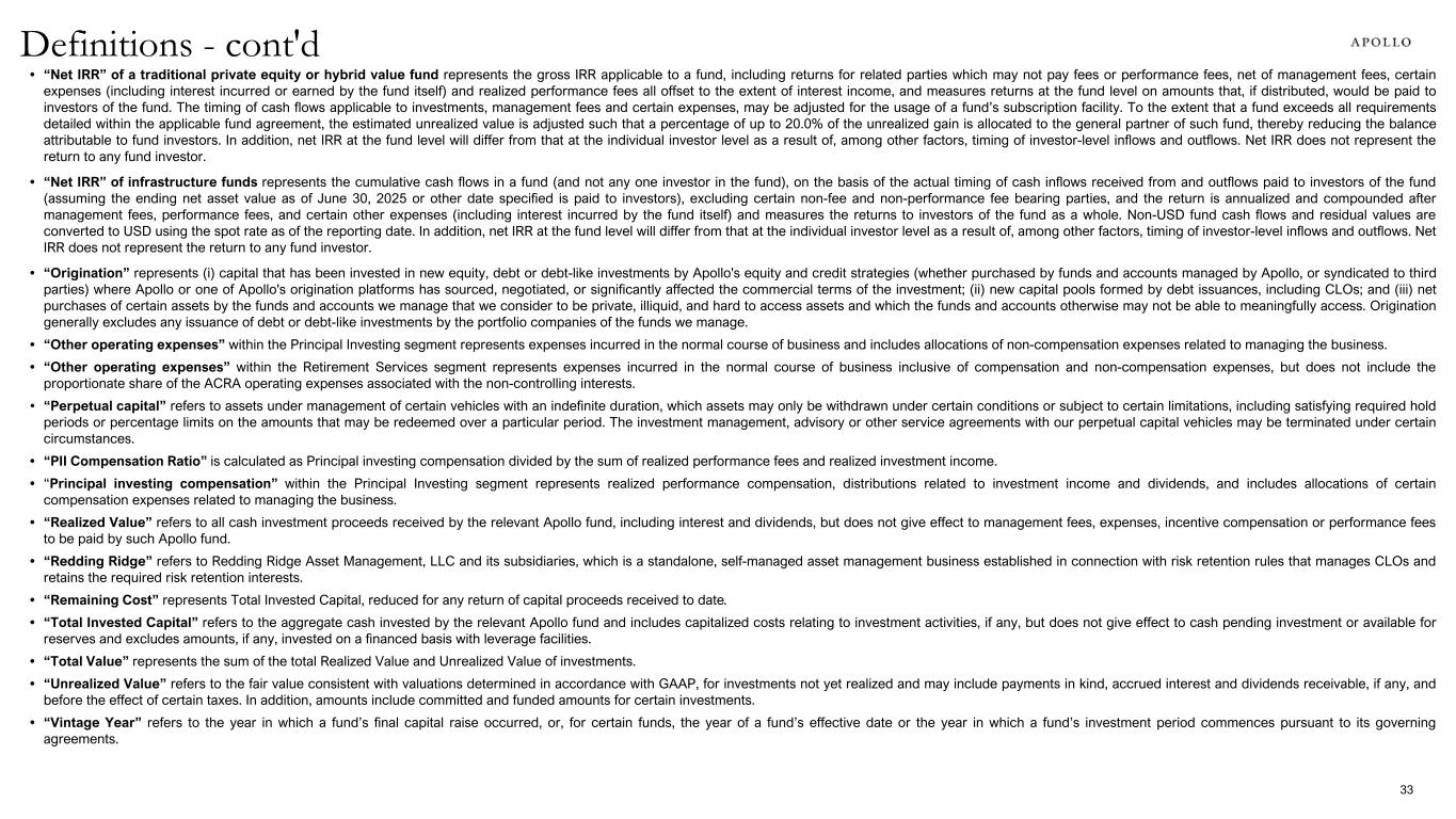 • Accord系列、ADIP基金和欧洲主融基金的“Gross IRR”表示基于扣除管理费、分配给普通合伙人的绩效费和某些其他费用之前的所有累计基金现金流的实际时间的基金的年化回报。计算可能包括某些不支付费用的投资者。终值为截至报告日的资产净值。非美元计价(“美元”)基金现金流量和残值采用截至报告日的即期汇率折算为美元。此外,除其他因素外,由于投资者层面流入和流出的时间等因素,基金层面的总内部收益率将与个人投资者层面的不同。总IRR不代表任何基金投资者的回报。•传统私募股权或混合价值基金的“总IRR”表示与投资相关的累计现金流(i)对于进行此类投资的基金或基金而言,以及(ii)对于特定基金而言,在相关基金本身(而不是基金的任何一个投资者)中,在每种情况下,基于投资流入和流出的实际时间(对于假设在2025年6月30日或指定的其他日期进行处置的未实现投资)按季度总额汇总,回报按年计算并在管理费前复利,表现费和某些其他费用(包括基金本身产生的利息),并衡量基金投资的整体回报,而不考虑如果分配所有回报是否会支付给基金的投资者。此外,除其他因素外,由于投资者层面流入和流出的时间等因素,基金层面的总内部收益率将与个人投资者层面的不同。总IRR不代表任何基金投资者的回报。•基础设施基金的“总IRR”表示基金本身(而不是基金的任何一个投资者)中与投资相关的累计现金流量,以每项投资结束之日开始的现金流入和流出的实际时间(假设在2025年6月30日或指定的其他日期进行处置的未实现投资)为基础,回报在管理费、绩效费、和某些其他费用(包括基金本身所产生的利息),并从整体上衡量基金投资的回报,而不考虑如果分配所有回报是否会支付给基金的投资者。非美元基金现金流量和残值采用截至报告日的即期汇率折算为美元。此外,除其他因素外,由于投资者层面流入和流出的时间等因素,基金层面的总内部收益率将与个人投资者层面的不同。总IRR不代表任何基金投资者的回报。•信贷基金的“总回报”是指每月或每季度的时间加权回报,等于基金投资组合价值的百分比变化,并根据所有缴款和提款进行调整,在管理费、分配给普通合伙人的激励费用以及其他费用和开支的影响之前。这些类别的回报是针对各自战略中的所有基金和账户计算的,不包括为Athene、Athora和Apollo管理或可能管理公司总资产的很大一部分的某些其他实体管理的资产,或者Apollo仅提供某些其他与投资相关的服务的资产。某些选择不使用公允价值会计准则的基金和账户,也因缺乏回报而被排除在外。资产支持金融策略的回报不包括CRE债务和ACTC基金。CLO的回报代表资产的总回报。多个时期的回报是通过将每个时期的回报与时间进行几何联系来计算的。•“HoldCo”是指Apollo Global Management, Inc. •资产管理部门内的“流入”表示(i)在单个策略层面,认购、承诺和其他可用资本的增加,例如收购或杠杆,扣除策略间的转移,以及(ii)在汇总基础上,信贷和股票策略的流入之和。•“强制可转换优先股”是指股东周年大会的6.75% A系列强制可转换优先股。•“净投资资产”是指直接支持雅典娜净储备负债以及剩余资产的投资。净投资资产用于净投资赚取率的计算,用于分析Athene投资组合的盈利能力。净投资资产包括(a)财务状况表上的总投资,AFS证券、交易证券和按成本或摊余成本计算的抵押贷款,不包括衍生工具,(b)现金和现金等价物以及限制性现金, (c)对关联方的投资,(d)应计投资收益,(e)VIE和VOE资产、负债和非控股权益调整,(f)应付和应收投资净额,(g)分出的保单贷款(抵消了投资总额中的直接保单贷款)以及(h)信用损失准备金调整。净投资资产不包括抵消相关现金头寸的衍生抵押品。Athene在其净投资资产计算中包括了支持其假定的扣留资金和modco协议的基础投资,并且不包括与分出再保险交易相关的基础投资,以便使资产与收到的收入相匹配。Athene认为,对再保险的调整提供了对其拥有经济敞口的资产的看法。净投资资产包括Athene在ACRA投资中的比例份额,基于其经济所有权,但不包括与非控股权益相关的投资的比例份额。净投资资产按相关期间的季度数进行平均,以计算该期间的净投资赚取率。虽然Athene认为净投资资产是一个有意义的财务指标,并增强了对其投资组合潜在驱动因素的理解,但它不应被用作根据美国公认会计原则列报的总投资(包括关联方)的替代品。•“净投资收益率”的计算方法是,Athene的净投资资产收益除以相关期间的平均净投资资产,按中期期间的年化基准列报。•“净投资价差”衡量的是Athene的投资业绩加上其战略资本管理费,减去其资金总成本。净投资赚取率是衡量Athene投资业绩的关键指标,而资金成本则是衡量其保单持有人利益和负债成本的关键指标。• Accord系列、ADIP基金和欧洲主融基金的“净IRR”表示基金在扣除管理费、分配给普通合伙人的绩效费和某些其他费用后的年化回报,按支付此类费用的投资者计算。终值为截至报告日的资产净值。非美元基金现金流量和残值采用截至报告日的即期汇率折算为美元。此外,除其他因素外,由于投资者层面流入和流出的时间等因素,基金层面的净内部收益率将与个人投资者层面的不同。净内部收益率不代表任何基金投资者的回报。32个定义-续