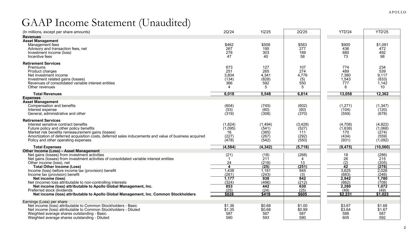 (以百万计,每股金额除外)2Q‘24 1Q’25 2Q‘25 YTD’24 YTD'25收入资产管理管理费462美元508美元583美元900美元1091美元咨询和交易费,净额267195277436472投资收益(亏损)278303189680492奖励费用4740587398退休服务保费673127107774234产品费用251265274489539净投资收益3,8044,3414,7767,3809,117投资相关收益(亏损)(134)(828)(5)1,543(833)合并可变利益实体收入3665925507771,142其他收入455610总收入6,0185,5486,81413,05812,362费用资产管理薪酬和福利(604)(745)(602)(1,271)(1,347)利息支出(53)(60)(104)(120)一般,行政及其他(319)(308)(370)(559)(678)退休服务利息敏感合约利益(1,824)(1,494)(3,428)(4,708)(4,922)未来保单及其他保单利益(1,095)(541)(527)(1,638)(1,068)市场风险利益重新计量收益(损失)16(385)111170(274)递延购置成本摊销,递延出售诱因及所获业务价值(227)(267)(292)(434)(559)保单及其他经营开支(478)(542)(550)(931)(1,092)总开支(4,584)(4,342)(5,718)(9,475)(10,060)其他收入(亏损)–资产管理投资活动净收益(亏损)(21)(18)(268)18(286)综合可变利益实体投资活动净收益(亏损)1211426215其他收入(亏损),净额24(218)13(2)(205)其他收入总额(亏损)4(25)(251)42(276)所得税前收入(亏损)(拨备)收益1,4381,1818453,6252,026所得税(拨备)收益(261)(243)(3)(683)(246)净收入(亏损)1,1779388422,9421,780归属于非控股权益的净(收益)亏损(324)(496)(212)(662)(708)归属于Apollo Global Management, Inc.的净收入(亏损)8534426302,2801,072优先股股息(25)(24)(25)(49)(49)归属于Apollo Global管理层的净收入(亏损),Inc.普通股股东828美元418美元605美元2,231美元1,023美元每股收益(亏损)归属于普通股股东的净利润(亏损)-基本1.36美元0.68美元1.00美元3.67美元1.68美元归属于普通股股东的净利润(亏损)-稀释后1.35美元0.68美元0.99美元3.64美元1.67美元加权平均流通股-基本587587587588587加权平均流通股-稀释后590593590605592 GAAP损益表(未经审计)2