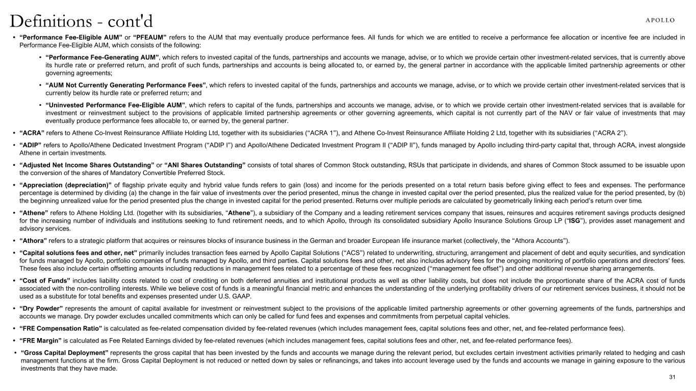 •“绩效费合格AUM”或“PFEAUM”是指最终可能产生绩效费的AUM。我们有权获得绩效费分配或奖励费的所有基金均包含在符合绩效费资格的AUM中,其中包括:•“产生绩效费AUM”,指我们管理、提供建议或我们向其提供某些其他投资相关服务的基金、合伙企业和账户的投资资本,目前高于其门槛率或优先回报,并且此类基金、合伙企业和账户的利润正在分配给或赚取,普通合伙人根据适用的有限合伙协议或其他管理协议;•“AUM目前未产生履约费用”,指我们管理、建议的基金、合伙企业和账户的投入资本,或我们向其提供的某些其他投资相关服务目前低于其门槛率或优先回报;•“未投资的履约费用合格AUM”,指我们管理、建议的基金、合伙企业和账户的资本,或我们向其提供可用于投资或再投资的某些其他投资相关服务,但须遵守适用的有限合伙协议或其他管理协议的规定,这些资本目前不属于可能最终产生可分配给普通合伙人或由普通合伙人赚取的业绩费用的投资的资产净值或公允价值的一部分。•“ACRA”是指Athene Co-Invest Reinsurance Affiliate Holding Ltd连同其子公司(“ACRA 1”),以及Athene Co-Invest Reinsurance Affiliate Holding 2 Ltd连同其子公司(“ACRA 2”)。•“ADIP”是指Apollo/Athene专用投资计划(“ADIP I”)和Apollo/Athene专用投资计划II(“ADIP II”),由Apollo管理的基金包括第三方资本,通过ACRA与Athene一起投资于某些投资。•“调整后的已发行净收入股份”或“ANI已发行股份”包括已发行普通股的总股份、参与分红的RSU以及假定在强制可转换优先股的股份转换后可发行的普通股股份。•旗舰私募股权和混合价值基金的“增值(折旧)”是指在费用和支出生效之前,按总回报基准列报的期间的收益(亏损)和收入。业绩百分比的确定方法是:(a)列报期间的投资公允价值变动,减去列报期间的投入资本变动,加上列报期间的已实现价值,再除以(b)列报期间的期初未实现价值加上列报期间的投入资本变动。多个时期的回报是通过将每个时期的回报与时间进行几何联系来计算的。•“Athene”指Athene Holding Ltd.(连同其附属公司,“Athene”),该公司的附属公司和领先的退休服务公司,发行、再保险和收购专为越来越多寻求为退休需求提供资金的个人和机构设计的退休储蓄产品,并且Apollo通过其合并子公司Apollo Insurance Solutions Group LP(“ISG”)向其提供资产管理和咨询服务。•“Athora”是指在德国和更广泛的欧洲人寿保险市场(统称为“Athora账户”)收购或再保险业务区块的战略平台。•“资本解决方案费用及其他,净额”主要包括Apollo Capital Solutions(“ACS”)赚取的与债务和股本证券的承销、结构、安排和配售以及Apollo管理的基金、Apollo管理的基金的投资组合公司和第三方的银团相关的交易费用。资本解决方案费用和其他,净额还包括持续监测投资组合运营的咨询费和董事费用。这些费用还包括某些抵消金额,包括与确认的这些费用的一定百分比相关的管理费减少(“管理费抵消”)和其他额外的收入分享安排。•“资金成本”包括与递延年金和机构产品的计入成本相关的负债成本以及其他负债成本,但不包括与非控股权益相关的ACRA资金成本的比例份额。虽然我们认为资金成本是一个有意义的财务指标,并增强了对我们退休服务业务潜在盈利驱动因素的理解, 它不应被用作根据美国公认会计原则列报的总收益和费用的替代品。•“干粉”是指根据我们管理的基金、合伙企业和账户的适用有限合伙协议或其他管理协议的规定,可用于投资或再投资的资本金额。干粉不包括未催缴的承诺,只能催缴基金费用支出和永续资本载体的承诺。•“FRE薪酬比率”的计算方法是与费用相关的薪酬除以与费用相关的收入(其中包括管理费、资本解决方案费用和其他、净额和与费用相关的绩效费用)。•“FRE Margin”的计算方法是与费用相关的收益除以与费用相关的收入(其中包括管理费、资本解决方案费用和其他、净额和与费用相关的绩效费用)。•“总资本部署”表示我们管理的基金和账户在相关期间投入的总资本,但不包括主要与公司的对冲和现金管理职能相关的某些投资活动。总资本部署不会因销售或再融资而减少或抵消,并考虑到我们管理的基金和账户在获得他们所进行的各种投资的敞口时所使用的杠杆作用。31个定义-续