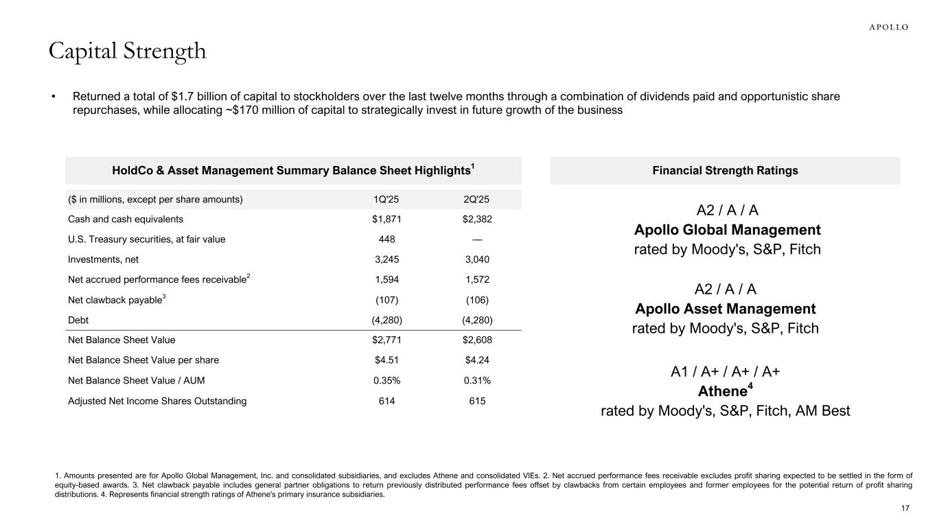 HoldCo & Asset Management资产负债表摘要亮点1财务实力评级(百万美元,每股金额除外)1Q‘25 2Q’25现金和现金等价物1,871美元2,382美元美国国债,按公允价值计算448 —投资,净额3,2453,040应收应计业绩费用净额21,5941,572应付回款净额3(107)(106)债务(4,280)(4,280)资产负债表净值2,771美元2,608每股资产负债表净值4.51美元4.24美元资产负债表净值/AUM 0.35% 0.31%调整后已发行净收益股614615 A2/A 阿波罗资产管理 Management评级由穆迪,标普,惠誉A1/a +/a +/a + Athene4评级,获穆迪、标普、惠誉、AM Best 1。呈列的金额为Apollo Global Management,Inc.和合并后的子公司,不包括Athene和合并VIE。2.应收应计绩效费用净额不包括预计以股权奖励形式结算的利润分成。3.应付回拨净额包括普通合伙人返还先前分配的绩效费用的义务,这些义务被某些雇员和前雇员为利润分享分配的潜在回报而进行的回拨所抵消。4.代表Athene的初级保险子公司的财务实力评级。Capital Strength 17 A2/A/A Apollo Global管理公司获穆迪、标普、惠誉评级•在过去12个月中,通过支付股息和机会性股票回购相结合的方式,向股东返还了总计17亿美元的资本,同时分配了约1.7亿美元的资本,用于对业务的未来增长进行战略投资