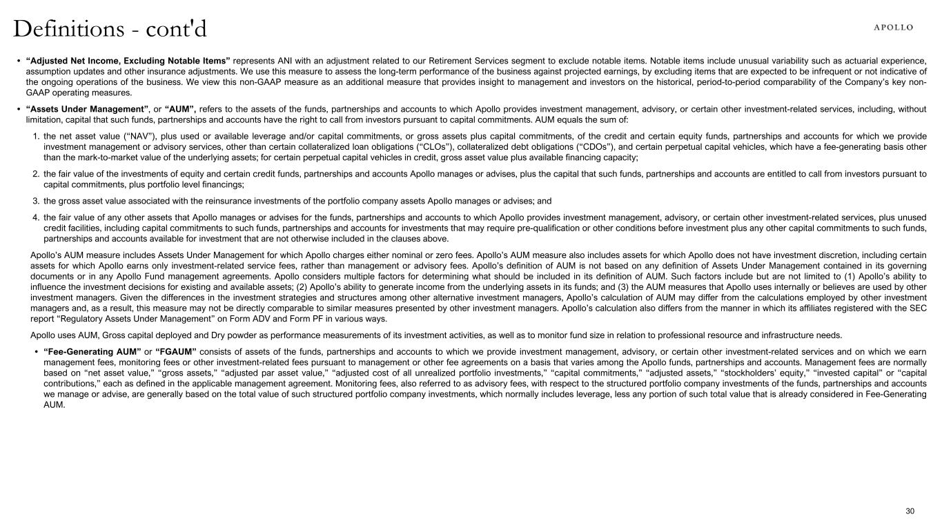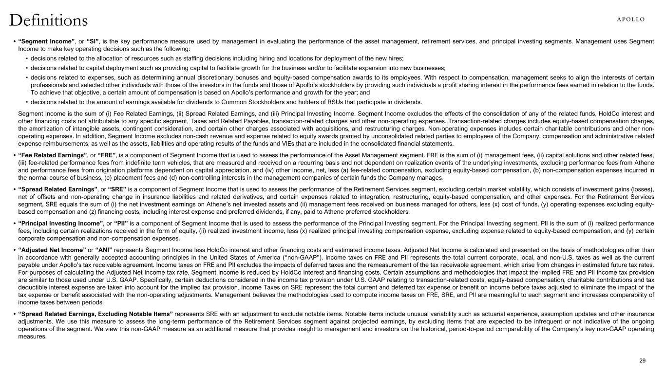 •“分部收入”,即“SI”,是管理层在评估资产管理、退休服务和本金投资分部的业绩时使用的关键绩效衡量标准。管理层使用分部收入作出以下关键经营决策:▪与资源分配有关的决定,例如人员配置决定,包括雇用和部署新雇员的地点;▪与资本部署相关的决策,例如提供资本以促进业务增长和/或促进向新业务的扩张;▪与费用相关的决定,例如确定年度酌情奖金和基于股权的员工薪酬奖励。关于薪酬,管理层寻求使某些专业人士和选定的其他个人的利益与基金投资者和阿波罗股东的利益保持一致,方法是向这些个人提供与基金相关的业绩费用所赚取的利润分成权益。为实现这一目标,根据Apollo当年的业绩和增长情况给予一定的补偿;而▪与普通股股东和参与分红的RSU持有人可用于分红的收益金额相关的决策。分部收入是(i)费用相关收益、(ii)价差相关收益和(iii)本金投资收益之和。分部收入不包括合并任何相关资金、控股公司利息和其他不属于任何特定分部的融资成本、税收和相关应付款项、与交易相关的费用和其他营业外支出的影响。与交易相关的费用包括基于股权的补偿费用、无形资产摊销、或有对价以及与收购相关的某些其他费用,以及重组费用。营业外支出包括一定的慈善捐款和其他营业外支出。此外,分部收益不包括与未合并关联方授予公司员工的股权奖励、薪酬和行政相关费用报销相关的非现金收入和费用,以及纳入合并财务报表的基金和VIE的资产、负债和经营成果。•“与费用相关的收益”,即“FRE”,是分部收入的一个组成部分,用于评估资产管理分部的业绩。FRE是(i)管理费、(ii)资本解决方案和其他相关费用、(iii)来自无限期车辆的与费用相关的业绩费用的总和,这些费用是按经常性计量和收取的,不依赖于基础投资的实现事件,不包括来自Athene的业绩费用和来自依赖于资本增值的发起平台的业绩费用,以及(iv)其他收入净额,减去(a)与费用相关的补偿,不包括基于股权的补偿,(b)在正常业务过程中产生的非补偿费用,(c)配售费和(d)在公司管理的某些基金的管理公司中的非控制性权益。•“与利差相关的收益”或“SRE”是分部收入的一个组成部分,用于评估退休服务分部的业绩,不包括某些市场波动,其中包括投资收益(损失),扣除保险负债和相关衍生工具的抵销和非经营性变化,以及与整合、重组、基于股权的薪酬以及其他费用相关的某些费用。对于退休服务分部,SRE等于(i)Athene净投资资产的净投资收益和(ii)为他人管理的业务收到的管理费,减去(x)资金成本,(y)不包括基于股权的薪酬的运营费用和(z)支付给Athene优先股东的融资成本,包括利息费用和优先股息(如有)之和。•“本金投资收益”,或“PII”是分部收益的一个组成部分,用于评估本金投资分部的业绩。对于本金投资部分,PII是(i)已实现的履约费,包括以股权形式收到的某些变现,(ii)已实现的投资收益,减去(x)已实现的本金投资补偿费用,不包括与基于股权的补偿相关的费用,以及(y)某些公司补偿和非补偿费用之和。•“调整后净收入”或“ANI”表示分部收入减去控股公司利息和其他融资成本以及估计所得税。调整后的净收入是根据美国公认会计原则(“非公认会计原则”)以外的方法计算和列报的。FRE和PII的所得税代表当前企业、地方、 和非美国税款以及阿波罗应收税款协议下的当期应付款。FRE和PII的所得税不包括因估计未来税率的变化而产生的递延税款和应收税款协议的重新计量的影响。为计算调整后的净所得税率,分部收入因控股公司利息和融资成本而减少。影响隐含FRE和PII所得税拨备的某些假设和方法与美国公认会计原则下使用的假设和方法相似。具体而言,在美国公认会计原则下的所得税条款中考虑的与交易相关成本、基于股权的薪酬、慈善捐款和可抵税利息费用相关的某些扣除被考虑到隐含税收条款。SRE的所得税是指为消除与非经营性调整相关的税收费用或利益的影响而调整的税前收入的当期和递延税收费用或利益总额。管理层认为,用于计算FRE、SRE和PII所得税的方法对每个细分市场都很有意义,并增加了不同时期所得税的可比性。•“价差相关收益,不包括值得注意的项目”代表SRE,并进行了调整以排除值得注意的项目。值得注意的项目包括不寻常的可变性,例如精算经验、假设更新和其他保险调整。我们使用这一衡量标准来根据预计收益评估退休服务部门的长期业绩,方法是排除那些预计不频繁或不表明该部门正在进行的运营的项目。我们将这一非GAAP衡量标准视为一项额外的衡量标准,可让管理层和投资者深入了解公司关键非GAAP运营衡量标准的历史、期间和期间的可比性。定义29