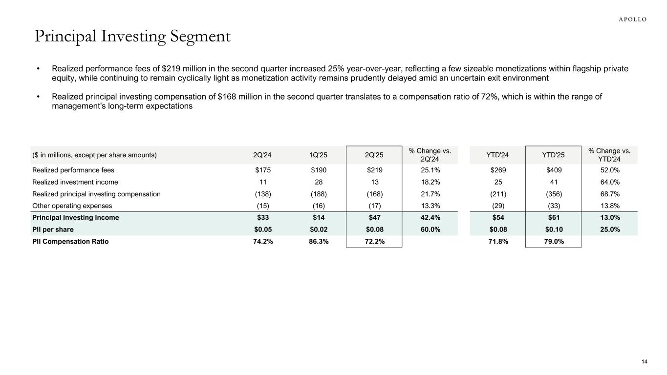 (百万美元,每股金额除外)2Q‘24 1Q’25 2Q‘25 %变动vs. 2Q’24 YTD‘24 YTD’24 YTD‘25 %变动vs. YTD’24已实现业绩费$ 175 $ 190 $ 21925.1% $ 269 $ 40952.0%已实现投资收益11281318.2% 254164.0%已实现本金投资报酬(138)(188)(168)21.7%(211)(356)68.7%其他经营费用(15)(16)(17)13.3%(29)(33)13.8%本金投资收益$ 33 $ 14 $ 4742.4% $ 54 $ 6113.0% PII每股$ 0.05 $ 0.02 $ 0.08 60.0% $ 0.08 $ 0.10 25.0% PII报酬比率74.2% 86.3% 72.2% 71.8% 79.0%本金投资分部季度同比增长25%,反映了旗舰私募股权内部的一些相当大的货币化,同时继续保持周期性清淡,因为在不确定的退出环境中,货币化活动仍然谨慎地推迟•第二季度实现的本金投资报酬为1.68亿美元,相当于报酬比率为72%,这在管理层的长期预期范围内