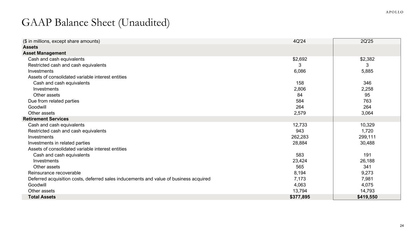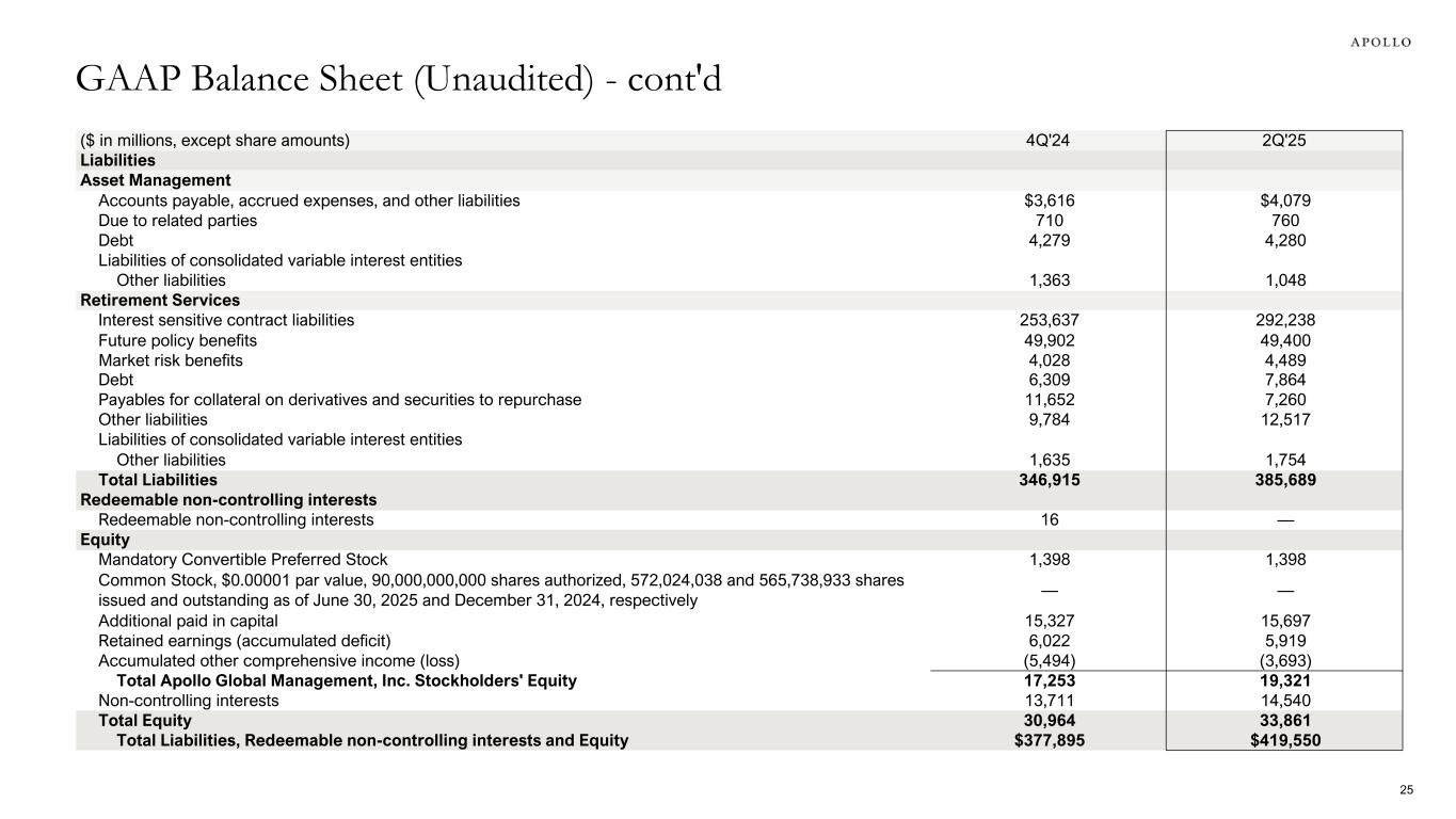 (百万美元,股份金额除外)Q4‘24 Q2’25负债资产管理应付账款、应计费用、和其他负债3,616美元4,079美元应付关联方款项710760债务4,2794,280合并可变利益实体的负债其他负债1,3631,048退休服务利息敏感合同负债253,637292,238未来保单利益49,90249,400市场风险利益4,0284,489债务6,3097,864应付衍生品和证券抵押品回购11,6527,260其他负债9,78412,517合并可变利益实体的负债其他负债1,6351,754总负债346,915385,689可赎回非控制性权益可赎回非控制性权益16 —股权强制可转换优先股1,3981,398普通股,面值0.00001美元,授权90,000,000,000股,截至2025年6月30日和2024年12月31日已发行和流通在外的股份分别为572,024,038股和565,738,933股——额外实收资本15,32715,697留存收益(累计亏损)6,0225,919累计其他综合收益(亏损)(5,494)(3,693)Apollo Global Management, Inc.股东权益合计17,25319,321非控股权益13,71114,540总权益30,96433,861总负债、可赎回非控股权益和权益377,895美元419,550美元GAAP资产负债表(未经审计)-续25
