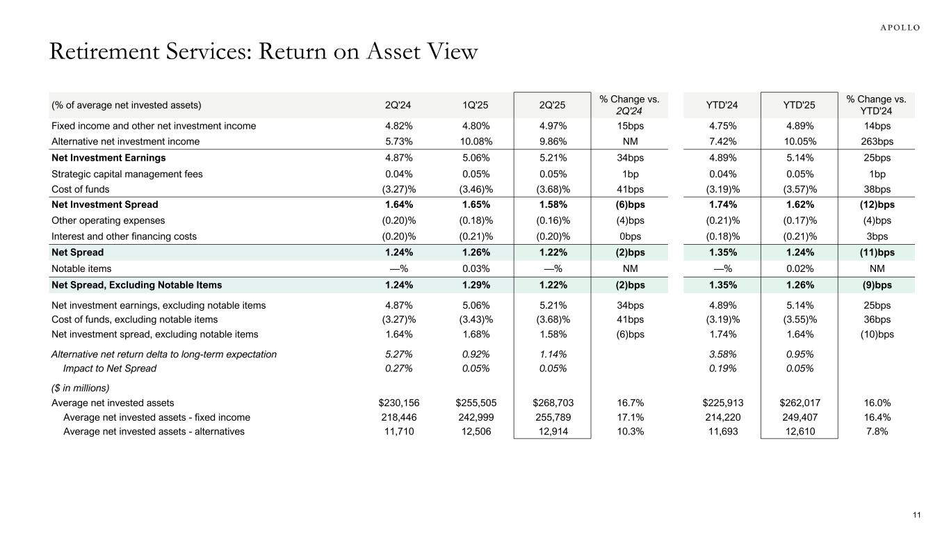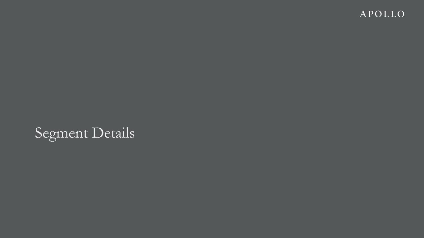 1.26% 0.20%(0.04)%(0.01)%(0.22)% 0.03% 1.22% 1Q‘25 2Q’25 Alts投资组合回报率较低新业务相对于径流的净资金成本较高且没有第一季度值得注意的项目投资组合亮点退休服务:投资组合和利差亮点12退休服务净利差桥梁(环比)1。截至2025年6月30日,2100亿美元的可供出售证券中有97%指定为NAIC 1或2。2.Athene的法定固定收益减值调整为包括与美国和百慕大受监管实体的平均投资资产相关的抵押贷款特定准备金的变化。3.行业平均值表示调整后的美国法定减值,以包括每个SNL Financial的抵押贷款特定准备金的变化。行业平均水平包括AEL、AMP、BHF、CRBG、EQH、FG、LNC、MET、PFG、PRU、VOYA和Transamerica。尾随五年平均数(2020-2024年)。4.定义为Athene截至2025年6月30日的净投资资产,总额为2750亿美元。5.名义上的浮动利率资产约为560亿美元,约占雅典娜净投资资产的20%。截至2025年6月30日,名义上的浮动利率负债约为410亿美元,约占Athene净投资资产的15%。6.其他项目代表各种项目,主要包括战略资本管理费、运营费用、利息和其他融资成本以及资产组合的变化。• Athene的固定收益投资组合1的97%投资于投资级资产• 阿波罗资产管理管理的目标是在Athene的投资组合中产生30至40个基点的资产优异表现•专注于直接发起、高级担保贷款,对发起的控制可带来更好的风险调整后回报• Athene持有额外的逆周期资产,如美国国债,如果利率下降,这些资产可以出售获利,并重新定位为更大的利差资产•过去五年总投资组合的历史平均年信贷损失为11个基点2,而该行业为13个基点3 •浮动利率投资组合:Athene投资组合的5%或150亿美元4投资于浮动利率资产,扣除浮动利率负债5 • Athene持有93亿美元的现金和现金等价物,或净投资资产的3.4%,截至2025年6月30日1.29% 0.20%(0.04)%(0.01)%(0.25)% 0.03% 1.22% 1Q'25 Q2退休服务净利差,不包括值得注意的项目Bridge(QoQ)在利差紧张和浮动费率收入较低的情况下的资产预付款其他项目6更高的保证金内部署收入更高的保证金内部署收入更高的Alts投资组合回报率更高的新业务净资金成本高于径流其他项目6在利差紧张和浮动费率收入较低的情况下的资产预付款