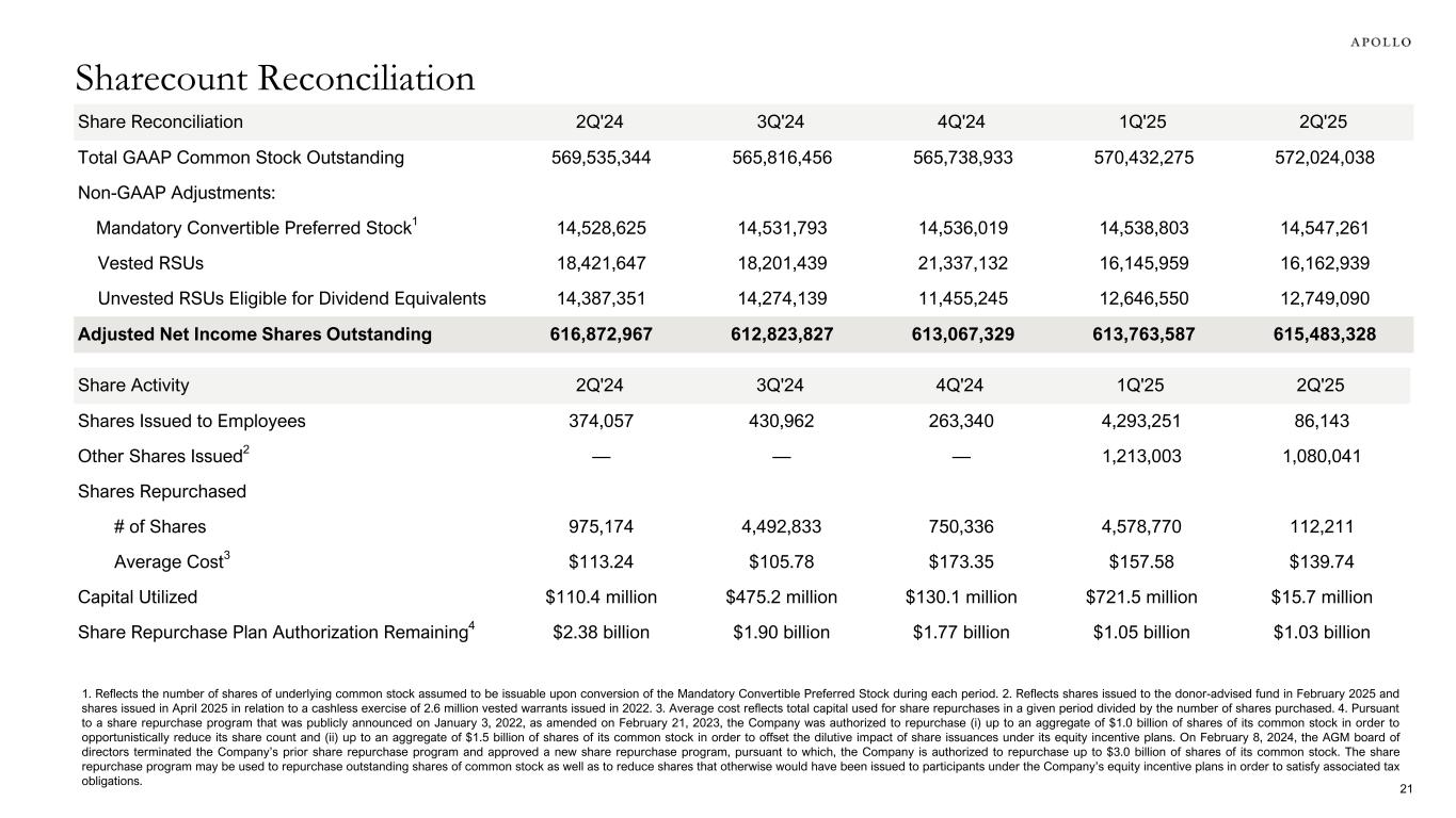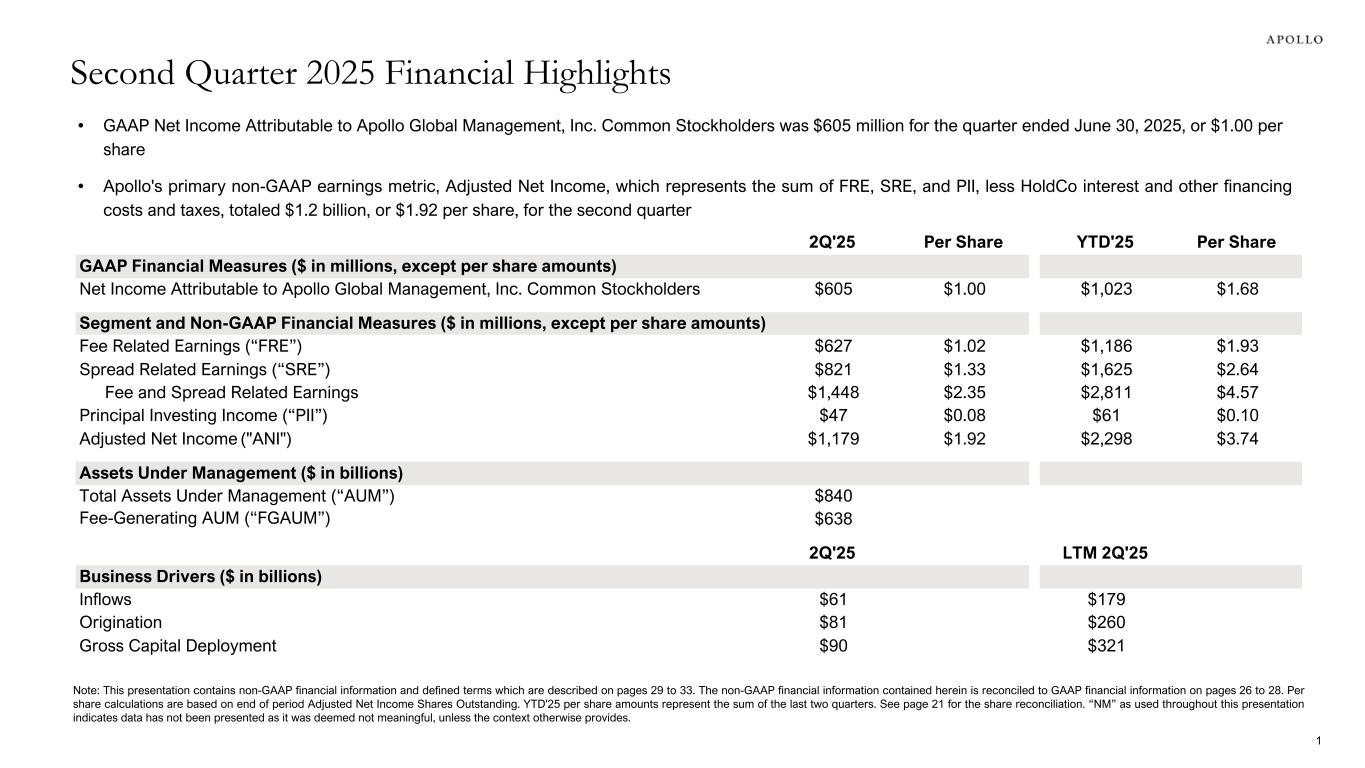 2Q‘25每股年初至今’25每股GAAP财务指标(百万美元,每股金额除外)归属于Apollo Global Management, Inc.普通股股东的净利润605美元1.00美元1023美元1.68美元分部和非GAAP财务指标(百万美元,费用相关收益(“FRE”)627美元1.02美元1186美元1.93美元价差相关收益(“SRE”)821美元1.33美元1,625美元2.64美元费用和价差相关收益1,448美元2.35美元2,811美元4.57美元本金投资收益(“PII”)47美元0.08美元61美元0.10美元调整后净收入(“ANI”)1,179美元1.92美元2,298美元3.74美元管理资产(十亿美元)管理资产总额(“AUM”)840美元收费AUM(“FGAUM”)638美元2Q‘25 LTM 2Q’25业务驱动因素(十亿美元)流入61美元179美元发起式81美元260美元总资本部署90美元321美元2025年第二季度Inc.截至2025年6月30日的季度,普通股股东为6.05亿美元,合每股1.00美元• Apollo的主要非GAAP收益指标调整后净收入,即FRE、SRE和PII之和,减去HoldCo利息和其他融资成本及税费,第二季度总计12亿美元,即每股1.92美元注:本演示文稿包含非GAAP财务信息和定义明确的术语,详见第29页至第33页。此处包含的非GAAP财务信息与第26至28页的GAAP财务信息进行了核对。每股计算基于期末调整后的已发行净收益股份。年初至今的每股金额为过去两个季度的总和。有关份额对账,请参见第21页。本演示文稿中使用的“NM”表示数据没有被呈现,因为它被认为没有意义,除非上下文另有规定。1