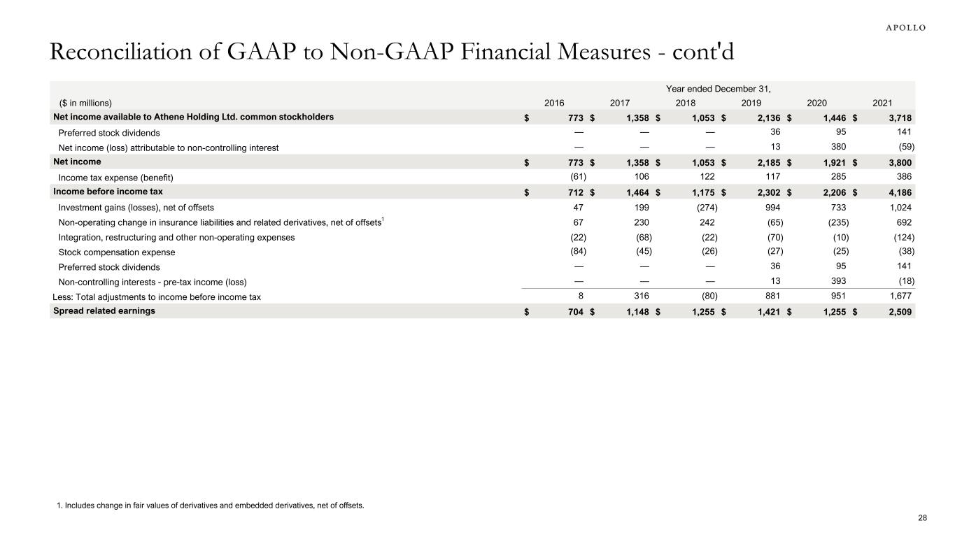 截至12月31日止年度(百万美元)201620172018201920202021可供Athene Holding有限公司普通股股东使用的净收入773美元1,358美元1,053美元2,136美元1,446美元3,718美元优先股股息—— 3695141归属于非控股权益的净收入(亏损)—— 13380(59)净收入773美元1,358美元1,053美元2,185美元1,921美元3,800美元所得税费用(收益)(61)106122117285386所得税前收入712美元1,464美元1,175美元2,302美元2,206美元4,186投资收益(亏损),冲销净额47 199(274)9947331,024保险负债及相关衍生工具非经营性变动,冲销净额167230242(65)(235)692融入,重组和其他营业外支出(22)(68)(22)(70)(10)(124)股票补偿支出(84)(45)(26)(27)(25)(38)优先股股息—— 3695141非控股权益-税前收入(亏损)—— 13393(18)减:所得税前收入调整总额8316(80)88 19511677与利差相关的收益$ 704 $ 1,148 $ 1,255 $ 1,421 $ 1,255 $ 2,509 GAAP与非GAAP财务指标的调节-续281。包括衍生工具和嵌入式衍生工具的公允价值变动,扣除抵销。