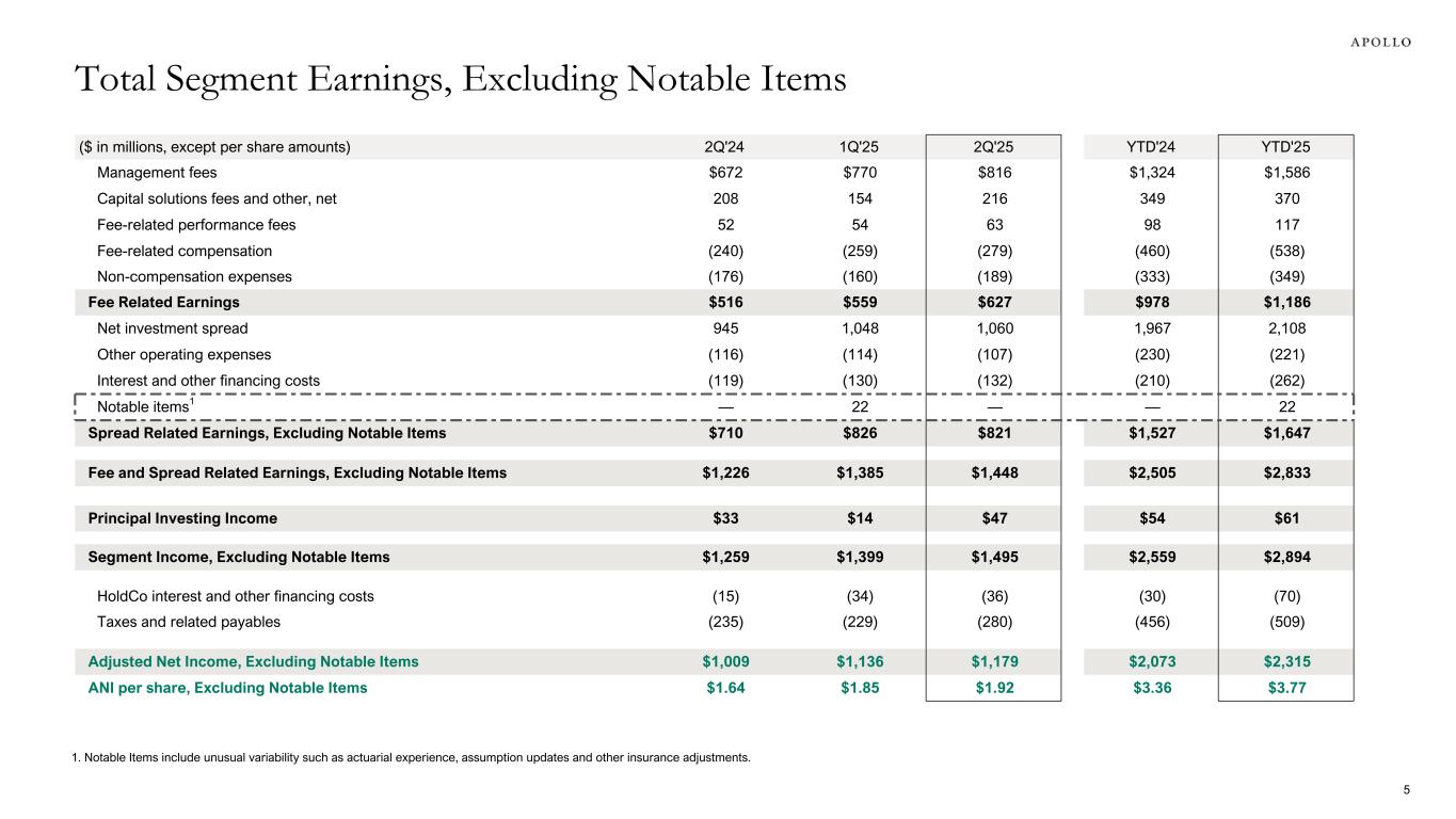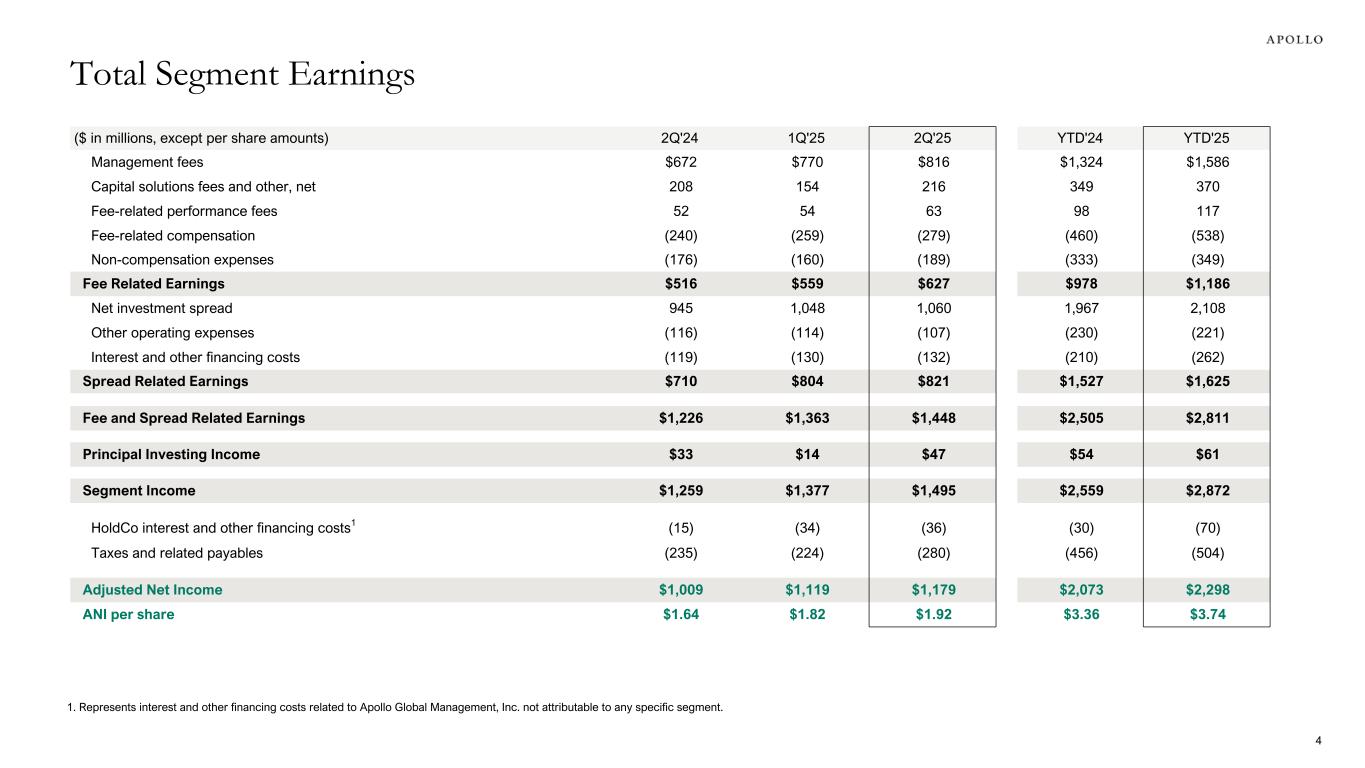 (百万美元,每股金额除外)2Q‘24 1Q’25 2Q‘25 YTD’24 YTD'25管理费$ 672 $ 770 $ 816 $ 1,324 $ 1,586资本解决方案费用及其他,净额208154216349370与费用相关的业绩费用52546398117与费用相关的补偿(240)(259)(279)(460)(538)非补偿费用(176)(160)(189)(333)(349)与费用相关的收益$ 516 $ 559 $ 627 $ 978 $ 1,186净投资价差9451,0481,0601,9672,108其他运营费用(116)(114)(107)(230)(221)利息和其他融资成本(119)(130)(132)(210)(262)与价差相关的收益$ 710 $ 804 $ 821 $ 1,527 $ 1,625与费用和价差相关的收益$ 1,226 $ 1,363 $ 1,448 $ 2,505 $ 2,811本金和其他融资成本1(15)(34)(36)(30)(70)税收和相关应付款项(235)(224)(280)(456)(504)调整后净收入$ 1,009 $ 1,119 $ 1,179 $ 2,073 $ 2,298 ANI每股$ 1.64 $ 1.82 $ 1.92 $ 3.36 $ 3.74 1。表示与Apollo Global管理公司相关的不可归属于任何特定分部的利息和其他融资成本。分部总收益4