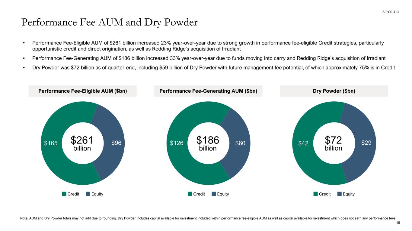 •符合绩效费条件的AUM为2610亿美元,同比增长23%,原因是符合绩效费条件的信贷策略强劲增长,特别是机会主义信贷和直接发起,以及Redding Ridge收购Irradiant •产生绩效费的AUM为1860亿美元,同比增长33%,原因是资金进入carry,Redding Ridge收购Irradiant • Dry Powder截至季度末为720亿美元,其中包括590亿美元具有未来管理费潜力的干粉,其中约75%为符合信用绩效费的AUM(十亿美元)产生绩效费的AUM(十亿美元)干粉(十亿美元)注:由于四舍五入,AUM和干粉总额可能不相加。干粉包括可用于投资的资本,包括在符合绩效费用的AUM中,以及可用于投资的资本,这些资本不赚取任何绩效费用。绩效费AUM和干粉15 $ 165 $ 96信贷股权$ 126 $ 60信贷股权$ 42 $ 29信贷股权$ 2610亿$ 1860亿$ 720亿