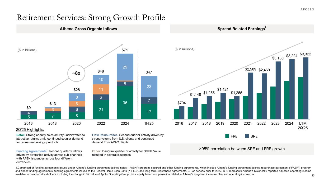 零售:在对退休储蓄产品的长期需求持续的情况下,强劲的年金销售活动承保到具有吸引力的回报Flow Reinsurance:第二季度活动受到美国客户强劲销量的推动以及亚太地区客户资金协议的持续需求1:由四种不同货币的FABN发行的子渠道多样化活动推动的创纪录的季度流入其他:活动的首个季度For Stable Value导致了几次发行$ 704 $ 1,148 $ 1,255 $ 1,421 $ 1,255 $ 2,509 $ 2,469 $ 3,108 $ 3,224 $ 3,322 FRE SRE 201620172018201920202021202220232024 LTM 2Q‘25 $ 9 $ 13 $ 28 $ 48 $ 71 $ 4757821361746573611810292320162018202020222024 1H’25 1.由根据Athene的融资协议支持票据(“FABN”)计划、担保和其他融资协议发行的融资协议组成,其中包括Athene的融资协议支持回购协议(“FABR”)计划和直接融资协议,向美国联邦Home Loan银行(“FHLB”)发放的融资协议和长期回购协议。2.对于2022年之前的期间,SRE代表Athene历史上报告的普通股股东可获得的调整后营业收入,不包括Apollo运营集团单位的公允价值变动、与Athene长期激励计划相关的基于股权的薪酬以及营业所得税。退休服务:强劲的增长情况Athene Gross Organic Inflow Spread相关收益2~8x(十亿美元)SRE和FRE增长之间> 95%的相关性13(百万美元)2Q'25亮点: