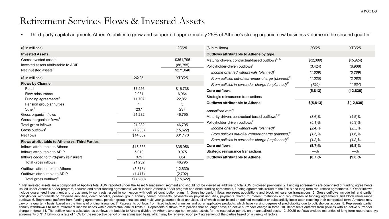 •第三方资本增强Athene的增长能力,支持了Athene第二季度强劲的有机新业务量的约25% 201。净投资资产是Apollo在资产管理部分下报告的总AUM的一个组成部分,不应被视为是之前披露的总AUM的累加。2.资助协议包括根据Athene的FABN计划发行的资助协议、担保协议和其他资助协议,其中包括Athene的FABR计划和直接资助协议、向FHLB发行的资助协议和长期回购协议。3.其他流入资金包括与固定缴款计划相关的保证投资和团体年金合同。4.无机流入总额代表收购和大宗再保险交易。5.总流出包括延期年金的全部和部分投保人提款、死亡抚恤金、养老金团体年金福利付款、支付年金的付款、与利息、到期和资金协议回购相关的付款以及阻止再保险流出。6.表示资金协议、养老金团体年金和多年保证固定年金的流出,所有这些都是根据规定的期限发生的,或者在达到其合同期限时基本上失效。金额可能每季度有所不同,具体取决于原始发行的时间。7.代表固定指数化年金和其他适用产品的流出,这些产品由于投保人的行为而具有不同程度的可预测性。8.表示在合同约定的年度限额内为满足退休收入需求而提取的部分年金。9.表示不再有效的主动退保费用的保单流出。10.表示有效的主动退保费用的保单流出。11.流出率的计算方法为归属于Athene的流出量除以Athene相应期间的平均净投资资产,按年计算。12.2Q'25流出不包括11亿美元的长期回购协议到期日,或相应期限的年化利率为1.6%,可能会在各方基于多种因素的共同协议下续签。退休服务流量和投资资产(百万美元)2Q‘25 YTD’25按渠道零售划分的流量$ 7,256 $ 16,738流量再保险2,0316,964资金协议211,70722,851养老金集团年金15其他3237237有机流入总额21,23246,795无机流入总额4 ——总流入总额21,23246,795总流出5(7,230)(15,622)净流量$ 14,002 $ 31,173归属于Athene vs.归属于第三方的流入Athene $ 15,838 $ 35,956归属于ADIP的流入5,0 199,975分给第三方再保险公司的流入375864总流入21,23246,795归属于Athene的流出(5,813)(12,830)归属于ADIP的流出(总流出5 $(7,230)$(15,622)(百万美元)2Q‘25投资资产总投资资产$ 361,795归属于ADIP的投资资产(86,755)净投资资产1 $ 275,040(百万美元)2Q’25年初至今' 25按类型分类归属于Athene的流出-到期驱动、基于合同的流出6,12 $(2,389)$(5,924)保单持有人驱动的流出7(3,424)(6,906)以收入为导向的提款(计划)8(1,609)(3,289)来自保单-退保-收费(计划内)9(1,025)(2,083)来自保单-退保-收费(计划外)10(790)(1,534)核心以合同为基础的流出6,12(3.6)%(4.5)%保单持有人驱动的流出7(5.1)%(5.3)%收入导向的提款(计划)8(2.4)%(2.5)%来自保单外-退保(计划)9(1.5)%(1.6)%来自保单内-退保-收费(计划外)10(1.2)%(1.2)%核心流出(8.7)%(9.8)%战略再保险交易—% —%归属于Athene的流出(8.7)%(9.8)%