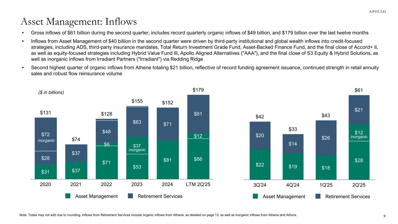$ 42 $ 33 $ 43 $ 61 $ 22 $ 19 $ 18 $ 28 $ 12 $ 20 $ 14 $ 26 $ 21 Asset Management Retirement Services 3Q‘24 4Q’24 1Q‘25 2Q’25 $ 131 $ 74 $ 128 $ 155 $ 152 $ 179 $ 31 $ 37 $ 71 $ 53 $ 81 $ 86 $ 6 $ 37 $ 12 $ 28 $ 37 $ 48 $ 63 $ 71 $ 81 $ 72 Asset Management Retirement Services 20202021202220232024 LTM 2Q'25 •第二季度总流入610亿美元,其中包括创纪录的490亿美元季度有机流入,和过去12个月的1790亿美元•第二季度资产管理公司流入400亿美元的资金,是由于第三方机构和全球财富流入以信贷为重点的策略,包括ADS、第三方保险授权、总回报投资级基金、资产支持金融基金,以及Accord + II的最终收盘,以及包括Hybrid Value Fund III、Apollo Aligned Alternatives(“AAA”)在内的以股票为重点的策略,以及S3 Equity & Hybrid Solutions的最终收盘,以及Irradiant Partners(“Irradiant”)经由Redding Ridge的无机流入•雅典娜有机流入总额为210亿美元的第二高季度,反映出创纪录的融资协议发行、零售年金销售持续强劲和强劲的流动再保险数量(十亿美元)资产管理:流入无机无机注:由于四舍五入,总数可能不会相加。退休服务的流入包括来自Athene的有机流入,详见第13页,以及来自Athene和Athora的无机流入。9无机