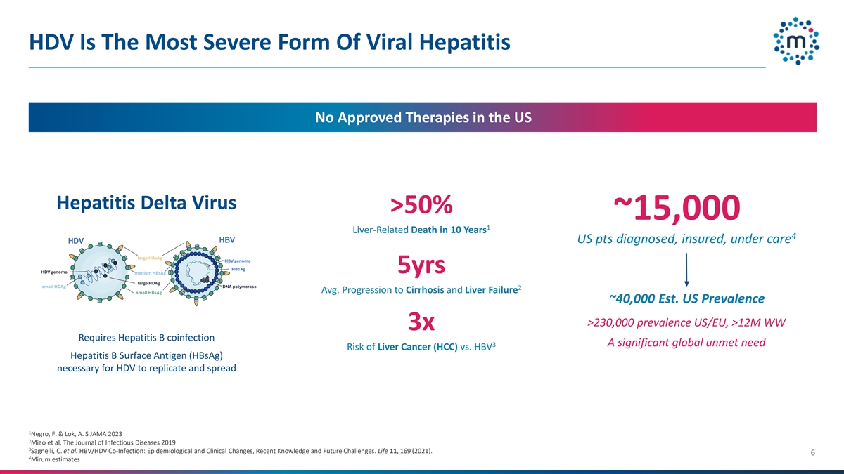 HDV是美国最严重的病毒性肝炎形式,没有批准的治疗方法,美国肝炎德尔塔病毒> 50%~15,000~10年1例肝脏相关死亡4名美国患者诊断、投保、接受护理5年2平均。进展为肝硬化和肝衰竭~40000 EST。美国流行率> 23万流行率美国/欧盟,> 12M WW 3x需要乙肝合并感染3肝癌(HCC)vs. HBV乙肝表面抗原(HBSAG)复制和传播所必需的全球显着未满足需求风险1 Negro,F. & Lok,A.S JAMA2023 2 Miao et al,the Journal of Infectious Diseases 20193 Sagnelli,C. et al. HBV/HDV合并感染:流行病学和临床变化、近期知识和未来挑战。生命11,169(2021)。64 Mirum估计