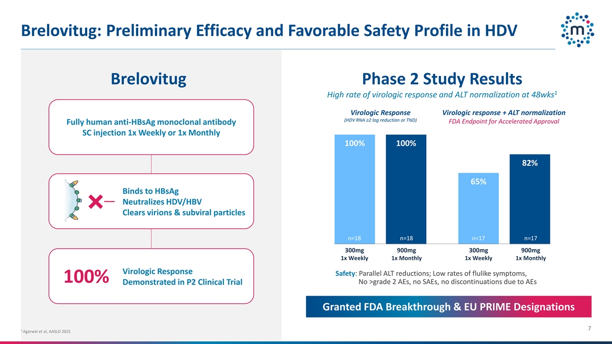 brelovitug:在HDV brelovitug 2期研究中的初步疗效和良好的安全性结果1 48wks时病毒学应答和ALT正常化的高率病毒学应答+ ALT正常化(丨HDV丨RNA ≥ 2 log减少或TND)FDA加速批准终点全人源抗HBSAg单克隆抗体SC注射液1次每周或1次每月100% 82% 65%与HBSAg结合可中和TERM0TERM/HBV清除病毒粒子&亚病毒颗粒n = 18 n = 18 n = 17 n = 17 300mg900mg300mg900mg1x周1x月1x周1x月1x月1x病毒学应答安全性:平行ALT减少;流感样症状发生率低,100% no > 2级AEs,no SAE,no discontinuations due to AEs demonstrated in P2 clinical trial granted FDA breakthrough & EU prime designations 71 Agarwal et al,AASLD 2025