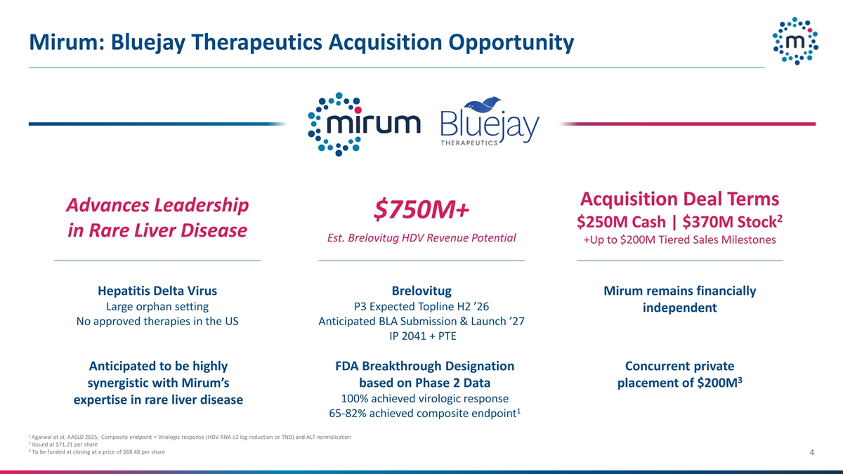 Mirum:Bluejay Therapeutics收购机会收购交易条款推进领导层7.5亿美元+ 2 2.5亿美元现金| 3.7亿美元罕见肝病EST股票。brelovitug HDV收入潜力+高达2亿美元的分层销售里程碑Hepatitis Delta病毒brelovitug Mirum在财务上仍然是大型孤儿设置P3预期顶线H2’26独立无批准疗法在美国预期BLA提交和推出' 27 IP 2041 + PTE预计将高度FDA突破性指定并发Private 3协同Mirum的基于2期数据放置的2亿美元100%实现了罕见肝病的病毒学应答专业知识1 65-82 %实现了复合终点1 Agarwal等人,AASLD 2025;Composite endpoint =病毒学应答(HDV RNA ≥ 2对数减少或TND)和ALT正常化2以每股71.21美元的价格发行3将在收盘时以每股68.48美元的价格融资4
