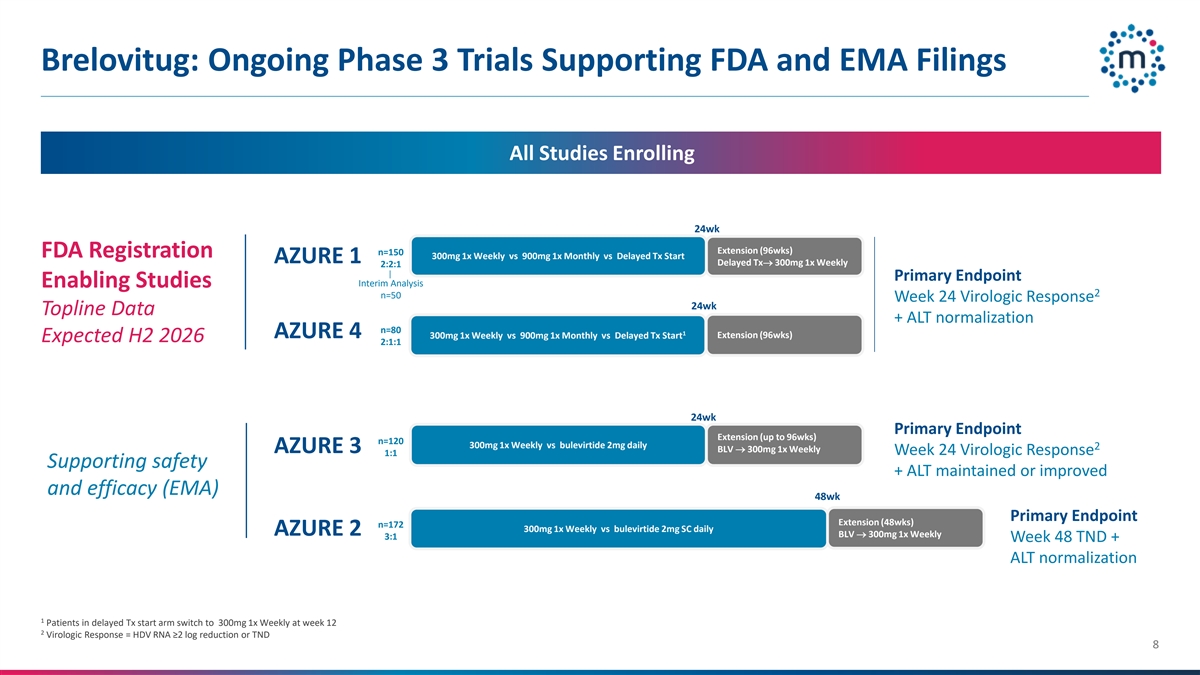 Brelovitug:正在进行的支持FDA的3期试验和EMA备案的所有研究均招募24wk延期(96wks)n = 150 FDA注册300mg每周1x vs 900mg每月1x vs延迟的TX开始AZURE 1延迟的TX → 300mg每周1x 2:2:1主要终点中期分析使能研究2 n = 50周24病毒学应答24wk顶线数据+ ALT正常化n = 801 AZURE 4 300mg每周1x vs 900mg每月1x vs延迟的TX开始延长(96wks)预计2026年下半年2:1:1 24wk主要终点延长(最多96wks)n = 120 300mg每周1x vs Bulevirtide每日2mg 2 BLV → 300mg每周1x AZURE 3周24病毒学应答1:1支持+ ALT维持或改善且疗效(EMA)48wk主要终点延长(48wks)n = 172 300mg 1x周vs布列韦肽2mg SC每日AZURE 2 BLV → 300mg 1x周3:1周48 TND + ALT正常化1延迟TX患者在第12周开始臂切换至300mg 1x周2病毒学应答= TERM0 RNA ≥ 2 log减少或TND 8