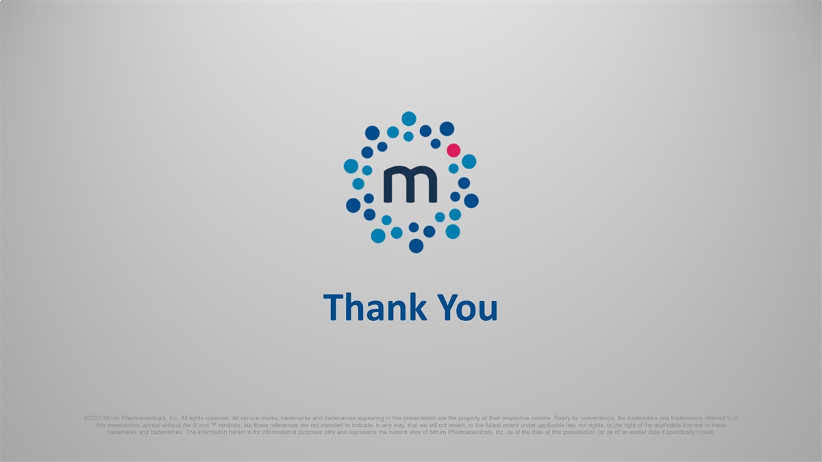 谢谢你©2025 Mirum Pharmaceuticals, Inc.版权所有。本演示文稿中出现的所有服务标记、商标和商号均为其各自所有者的财产。仅为方便起见,本演示文稿中提及的商标和商号出现时没有®和符号,但这些引用无意以任何方式表明,我们不会根据适用法律在最大程度上主张我们的权利,或适用许可人对这些商标和商号的权利。此处的信息仅供参考,代表Mirum制药,Inc.截至本演示文稿发布之日(或如果特别注明,则截至较早日期)的当前观点。