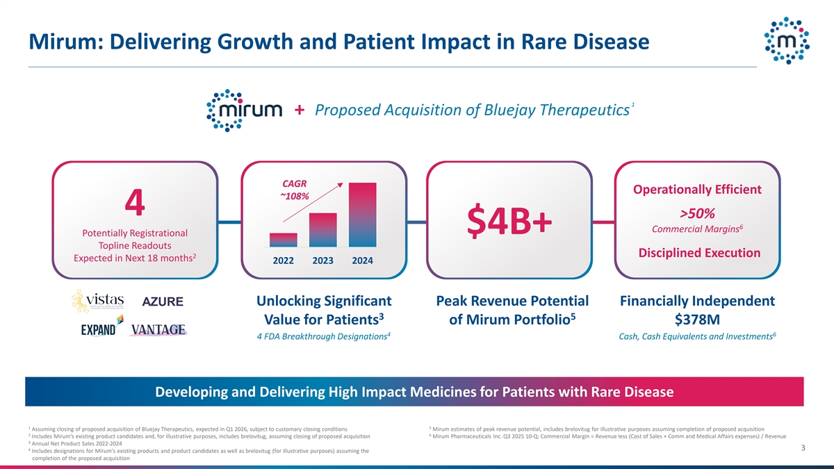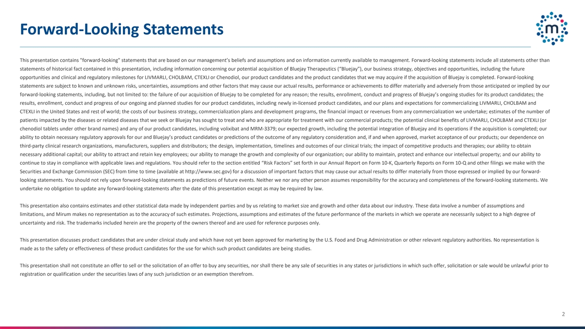 前瞻性陈述本演示文稿包含基于我们管理层的信念和假设以及管理层目前可获得的信息的前瞻性陈述。前瞻性陈述包括本演示文稿中除历史事实陈述之外的所有陈述,包括有关我们可能收购Bluejay Therapeutics(“Bluejay”)的信息、我们的业务战略、目标和机会,包括LIVMARLI、CHOLBAM、CTEXLI或雪诺二醇的未来机会以及临床和监管里程碑、我们的候选产品以及如果完成对Bluejay的收购我们可能获得的候选产品。前瞻性陈述受已知和未知风险、不确定性、假设和其他因素的影响,这些因素可能导致我们的实际结果、业绩或成就与我们的前瞻性陈述所预期或暗示的存在重大不利差异,包括但不限于:我们对Bluejay的收购因任何原因未能完成;Bluejay对其产品候选者正在进行的研究的结果、注册、进行和进展;我们对我们的产品候选者正在进行和计划进行的研究的结果、注册、进行和进展,包括新获得许可的产品候选者,以及我们将LIVMARLI商业化的计划和期望,美国和世界其他地区的CHOLBAM和CTEXLI;我们的商业战略、商业化计划和开发计划的成本,我们进行的任何商业化的财务影响或收入;估计受我们寻求或Bluejay寻求治疗的疾病或相关疾病影响的患者人数以及适合使用我们的商业产品进行治疗的患者人数;LIVMARLI、CHOLBAM和CTEXLI(或其他品牌下的钱杜醇片)以及我们的任何候选产品(包括volixibat和MRM-3379)的潜在临床益处;我们的预期增长,包括如果收购完成,Bluejay及其运营的潜在整合;我们有能力为我们和Bluejay的产品候选者获得必要的监管批准或对任何监管考虑的结果的预测,以及如果获得批准,我们的产品的市场接受度;我们对第三方临床研究组织、制造商、供应商和分销商的依赖;设计、实施,我们临床试验的时间表和结果;竞争性产品和疗法的影响;我们获得必要额外资本的能力;我们吸引和留住关键员工的能力;我们管理组织增长和复杂性的能力;我们维护、保护和增强我们的知识产权的能力;以及我们继续遵守适用法律法规的能力。请参阅我们不时向美国证券交易委员会(SEC)提交的10-K表格年度报告、10-Q表格季度报告和其他文件(可在http://www.sec.gov上查阅)中标题为“风险因素”的部分,以讨论可能导致我们的实际结果与我们的前瞻性陈述中明示或暗示的结果存在重大差异的重要因素。你不应该依赖前瞻性陈述作为对未来事件的预测。我们和任何其他人均不对前瞻性陈述的准确性和完整性承担责任。我们不承担在本演示文稿发布之日后更新任何前瞻性陈述的义务,除非法律可能要求。本演示文稿还包含独立方和我们就市场规模和增长做出的估计和其他统计数据,以及有关我们行业的其他数据。这些数据涉及一些假设和限制,Mirum对这些估计的准确性不作任何表示。对我们经营所在市场未来表现的预测、假设和估计必然会受到高度的不确定性和风险。此处包含的商标是其所有者的财产,仅用于参考目的。本演示文稿讨论了正在进行临床研究且尚未获得美国食品和药物管理局或其他相关监管机构批准上市的候选产品。对于这些候选产品用于正在研究此类候选产品的用途的安全性或有效性,不作任何陈述。本演示不应构成出售要约或购买任何证券的要约邀请,也不应在根据任何此类司法管辖区的证券法进行注册或获得资格或豁免之前,在此类要约、邀请或出售将是非法的任何州或司法管辖区进行任何证券出售。2