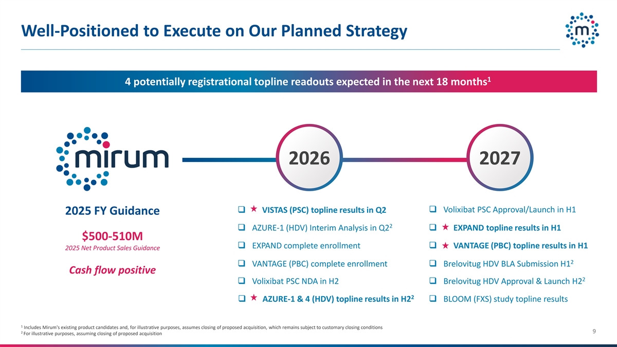 有能力执行我们计划的战略14预计在未来18个月内有4个潜在的注册顶线读数20262027 q VISTAS(PSC)顶线结果Q2 q Volixibat PSC批准/在2025年上半年推出财政年度指导2 q AZURE-1(HDV)中期分析Q2扩大顶线结果H1 $ 500-5.1亿q扩大完全入学q VANTAGE(PBC)顶线结果2025年上半年净产品销售指导2 q VANTAGE(PBC)完全入学q brelovitug丨HDV丨BLA提交H1现金流正2 q Volixibat PSC NDA in H2q brelovitug丨HDV HDV批准&在H2q BLOOM(FXS)研究中,顶线结果1包括Mirum现有的候选产品,为说明目的,假设拟议收购已完成,但仍受惯例成交条件29为说明目的,假设拟议收购已完成