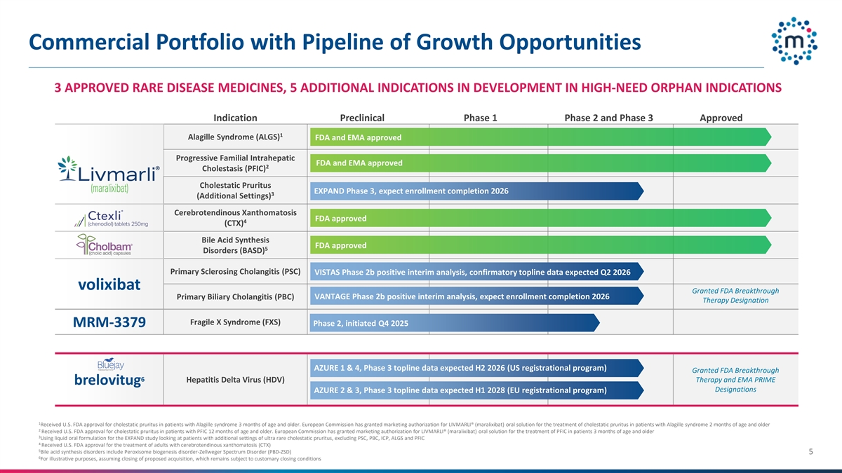 具有增长机会管道的商业组合3个已获批准的罕见病药物,5个开发中的其他适应症在高需要的孤儿适应症中的开发阶段临床前1期2和3期批准1个Alagille综合征(ALGS)FDA和EMA批准的进展性家族性肝内FDA和EMA批准的2个胆汁淤积症(PFIC)胆汁淤积性瘙痒扩展3期,预计注册完成20263(其他设置)®脑腱性黄瘤病FDA批准4(CTX)胆酸合成FDA批准5 Disorders(BASD)原发性硬化性胆管炎(PSC)VISTAS 2b期阳性中期分析,验证性顶线数据预计2026年第二季度volixibat授予FDA突破性原发性胆汁性胆管炎(PBC)VANTAGE 2b期阳性中期分析,预计注册完成2026年治疗指定脆性X综合征(FXS)第2期,启动2025年Q4 MRM-3379 AZURE 1 & 4,第3期顶线数据预计H2 2026(美国注册计划)授予FDA突破性6德尔塔肝炎病毒(HDV)治疗和EMA PRIME brelovitug指定AZURE 2 & 3,第3期顶线数据预计2028年上半年(欧盟注册计划)1获得美国FDA批准,用于3个月及以上Alagille综合征患者的胆汁淤积性瘙痒症。欧盟委员会已授予LIVMARLI上市许可®(maralixibat)口服溶液治疗2个月及以上Alagille综合征患者的胆汁淤积性瘙痒2获得美国FDA批准,用于PFIC12个月及以上患者的胆汁淤积性瘙痒症。欧盟委员会已授予LIVMARLI上市许可®(maralixibat)口服溶液用于治疗3个月及以上患者的PFIC 3使用液体口服制剂进行扩大研究,该研究着眼于具有额外环境的超罕见胆汁淤积性瘙痒症患者,不包括PSC、PBC、ICP、ALGS和PFIC4获得美国FDA批准,用于治疗成人脑腱性黄瘤病(CTX)5胆汁酸合成障碍包括过氧化物酶体生物发生障碍-齐薇格谱障碍(PBD-ZSD)56为说明目的,假设拟议收购完成,该收购仍受惯例完成条件的约束