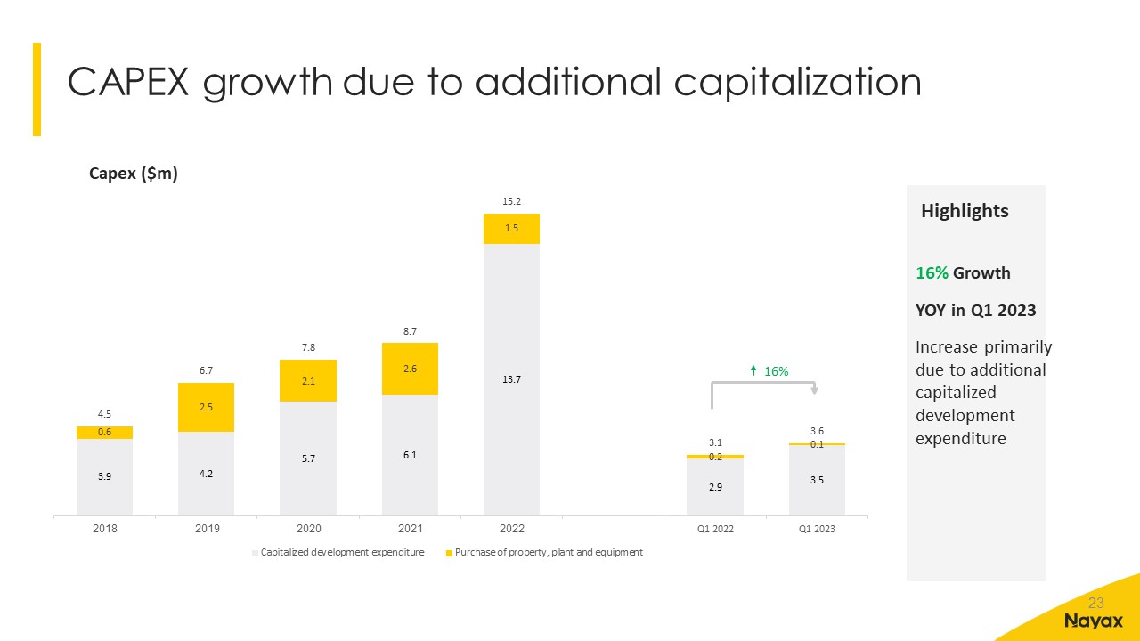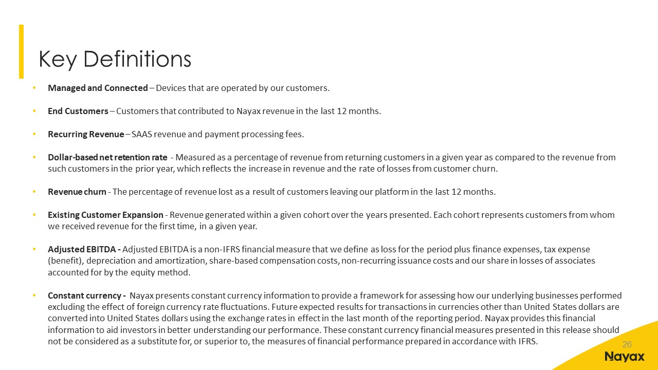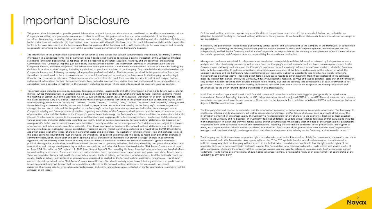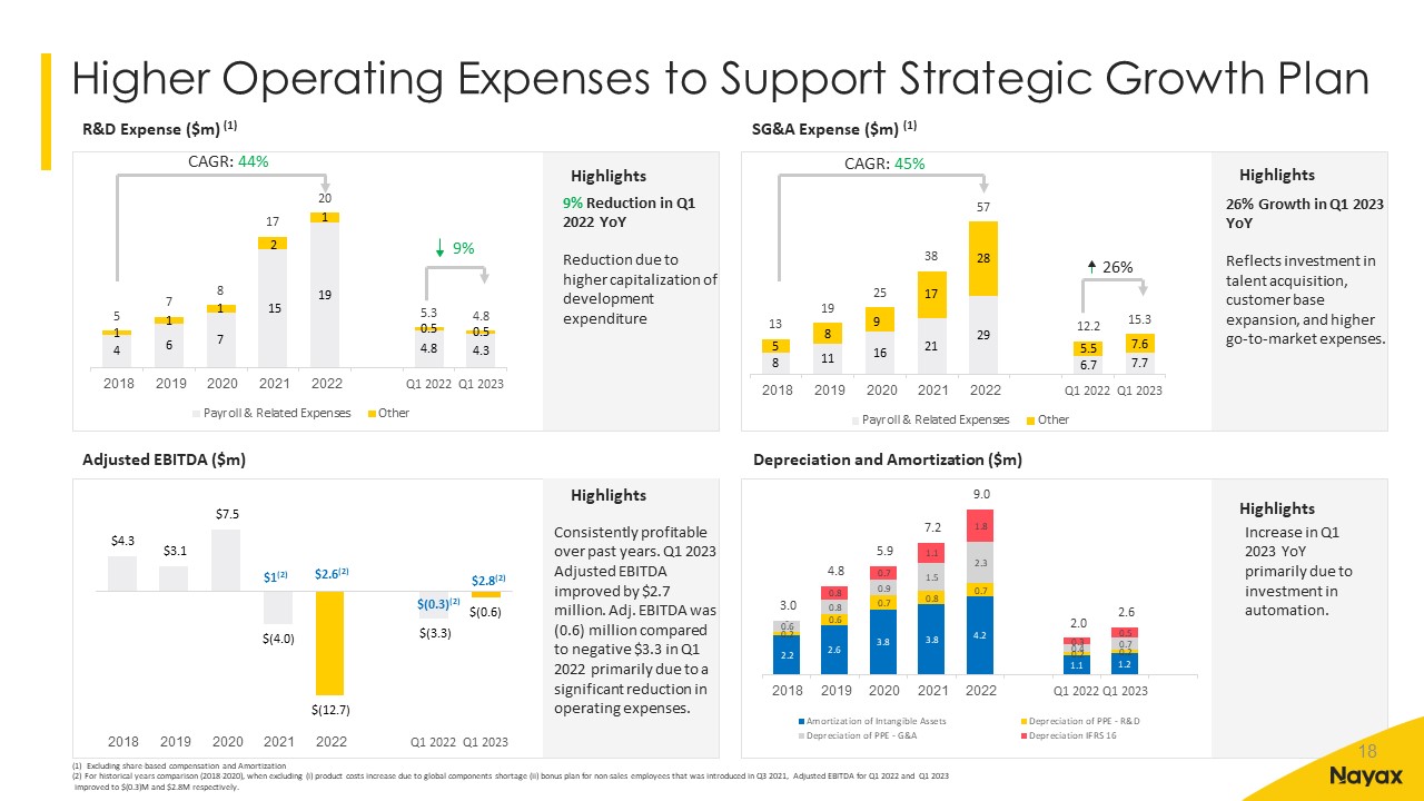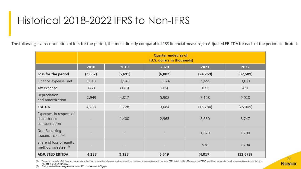 历史2018-2022年国际财务报告准则至非国际财务报告准则主要包括:(一)与我们2021年5月在TASE首次公开发行有关的费用和开支,不包括承销商折扣和佣金;(二)与我们2022年9月在纳斯达克上市有关的开支由于我们2021年在Tigapo的投资,权益法投资对象有所增长。25以下是该期间损失与所示各期间调整后EBITDA的对账,这是最直接可比的《国际财务报告准则》财务计量。截至(千美元)2018年2019年2020年2021年2022年期间亏损(3,632)(5,491)(6,083)(24,769)(37,509)财务费用净额5,0182,5453,8741,6553,021税项费用(47)(143)(15)632451折旧和摊销2,9494,8175,9087,1989,028 EBITDA 4,2881,7283,684(15,284)(25,009)股份补偿费用-1,4002,9658,8508,747非经常性发行费用(1)----1,8791,790应占权益法被投资方亏损(2)---5381,794调整后EBITDA 4,2883,1286,649(4,017)(