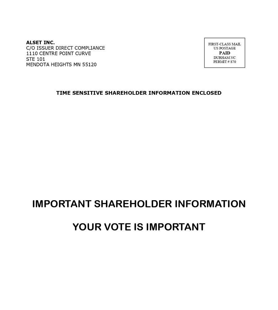 本代理声明、随附的代理卡以及截至2024年12月31日的财政年度的10-K表格年度报告(“年度报告”)可在https://www.alsetinc.com/上查阅。不过,该年度报告并不是代理征集材料的一部分。