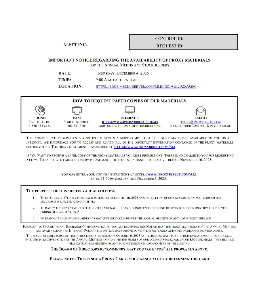 诚挚邀请您参加我们将于2025年12月4日东部标准时间上午9点召开的2025年年度股东大会。2025年股东年会将通过互联网以虚拟方式在https://edge.media-server.com/mmc/go/AEI2025AGM(“年会”)举行。年会将是一场股东“虚拟会议”,将在虚拟网络会议上通过互联网独家进行。不设实体会议地点,股东无法亲自出席年会。关于如何参加年会和证明持股证明的说明,发布在https://www.iproxydirect.com/上,以及您的代理卡。这意味着您可以通过访问上述网站在线参加年会、以电子方式投票表决您的股份并在在线会议期间提交问题。我们认为,举办“虚拟会议”将使更多的股东能够从世界各地的任何地点参加和参与。随附的年度会议通知和代理声明描述了我们将在会议上开展的业务,并提供了有关Alset Inc.的信息,您在投票时应考虑这些信息。