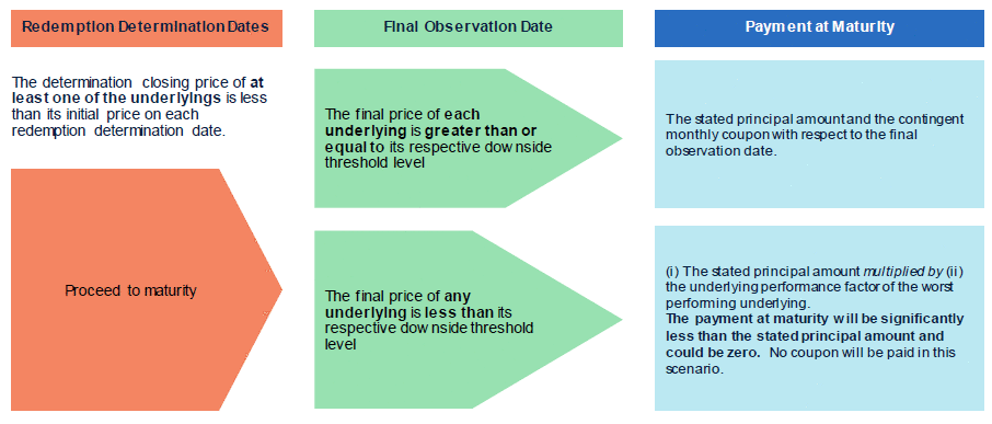 若证券未在到期前赎回,投资者将在到期时收到一笔款项,确定如下: ●如果每个标的的最终价格大于或等于其各自的下行阈值水平:(i)规定的本金金额和相对于最终观察日的或有月息票 ●如果任何标的的最终价格低于其各自的下行阈值水平:(i)规定的本金金额乘以(ii)表现最差标的的标的表现因子 在这种情况下,到期付款将大大低于规定的本金金额1000美元,并将代表您的投资损失超过30%,甚至可能是全部。 |