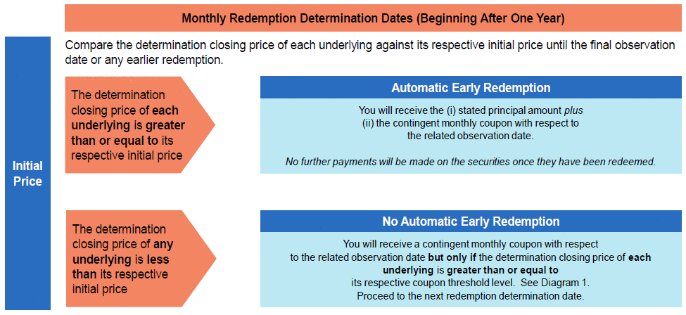 证券在原发行日后一年前不得提前赎回。在这1年的非赎回期之后,如果在2025年12月4日开始的任何赎回确定日,每个标的的确定收盘价大于或等于其各自的初始价格,则该证券将在相关的提前赎回日自动赎回以获得提前赎回付款。一旦赎回证券,将不会再支付任何款项。 若任何标的的确定收盘价低于其各自在相关赎回确定日的初始价,则该证券将不会在任何提前赎回日提前赎回。 |